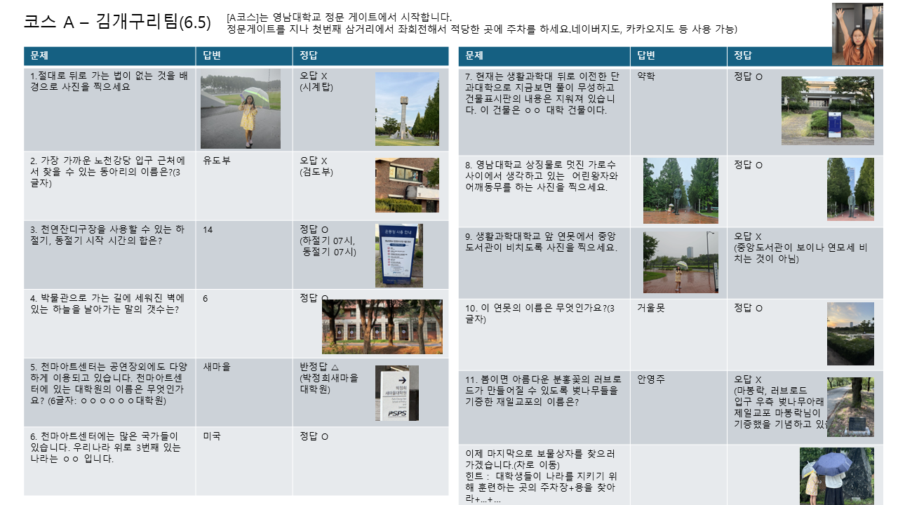 구글폼을 활용해서 3팀에게 각각의 추적 미션을 제시하고, 주관식 정답과 미션 사진찍기 등을 통해 개별 미션을 수행하고, 최종 집합지에 모여 마지막으로 함께 보물상자 찾기를 위해 암호를 풀고, 수행했던 미션 가운데 단서를 가지고 보물상자를 열었습니다. 10회차 동안 모두 수고하였습니다.