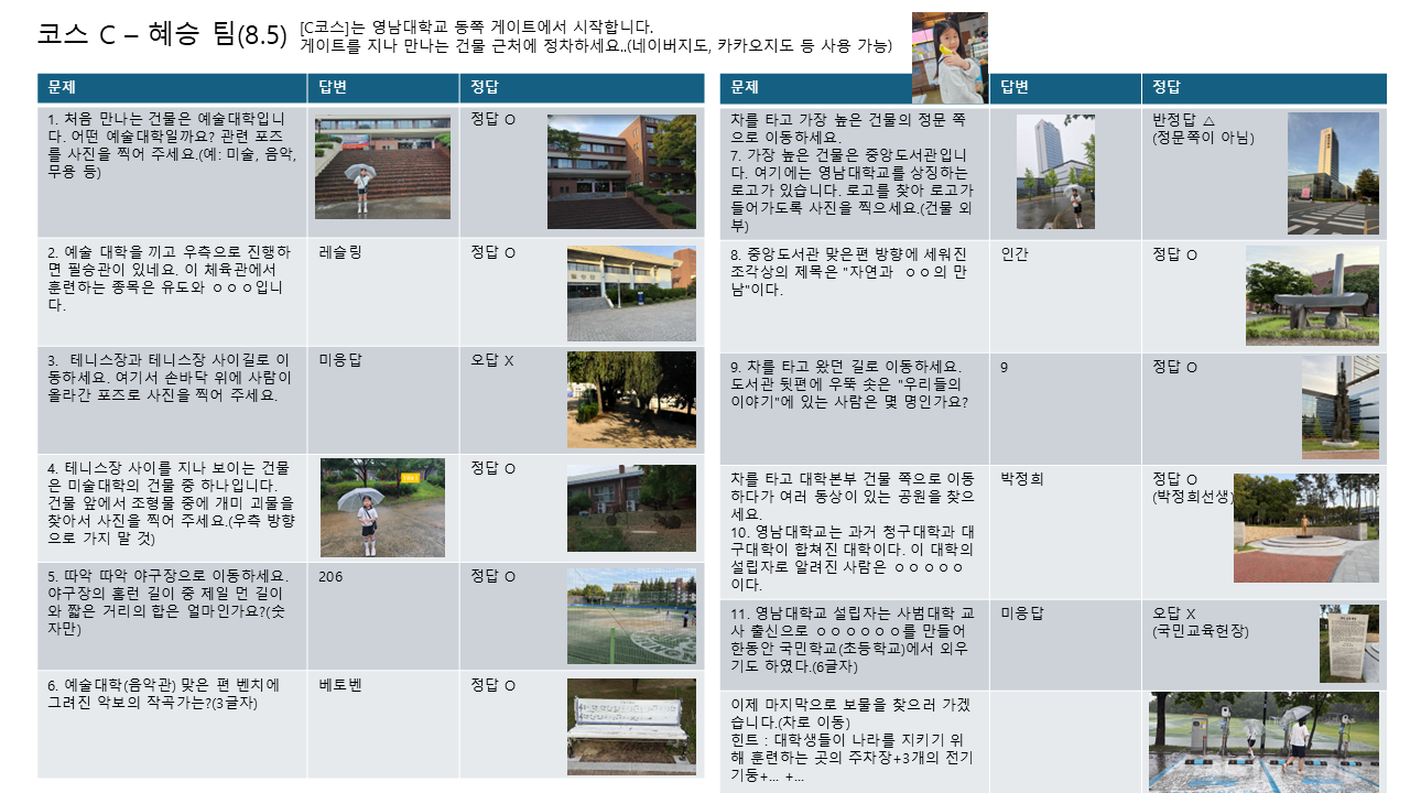 구글폼을 활용해서 3팀에게 각각의 추적 미션을 제시하고, 주관식 정답과 미션 사진찍기 등을 통해 개별 미션을 수행하고, 최종 집합지에 모여 마지막으로 함께 보물상자 찾기를 위해 암호를 풀고, 수행했던 미션 가운데 단서를 가지고 보물상자를 열었습니다. 10회차 동안 모두 수고하였습니다.