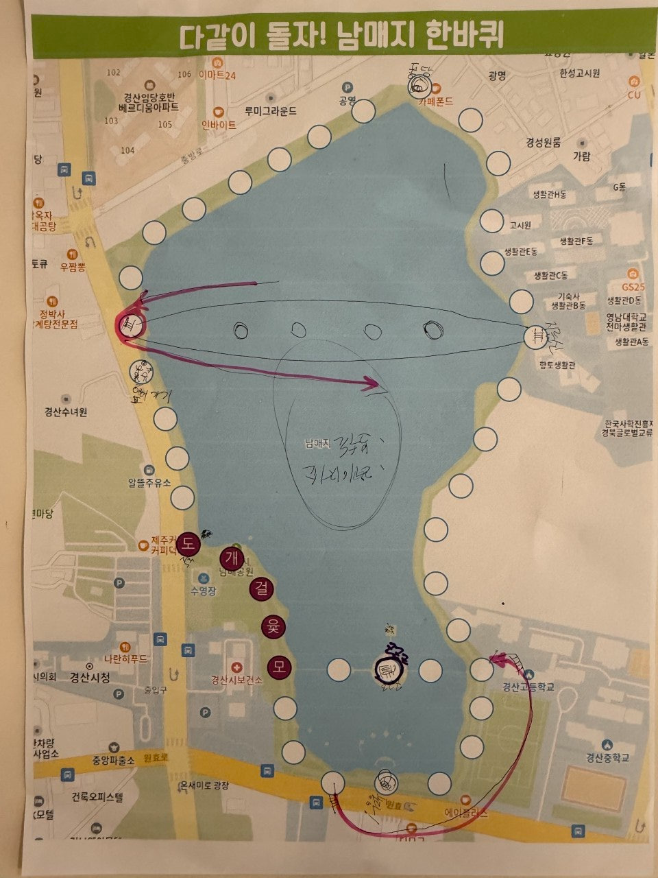 - 남매지 지도에 말판 만들고 윷놀이로 성인 vs 어린이로 경주하기