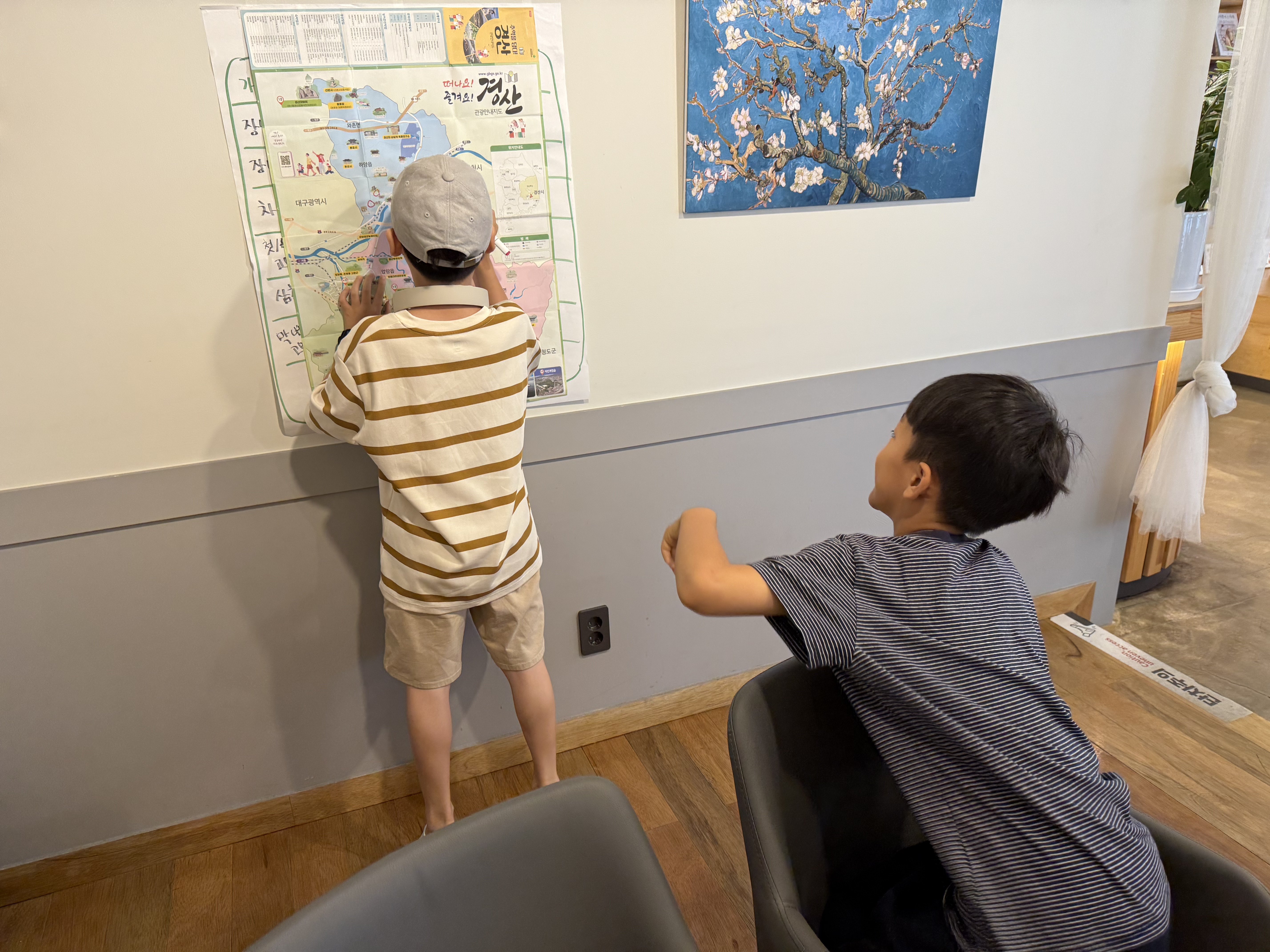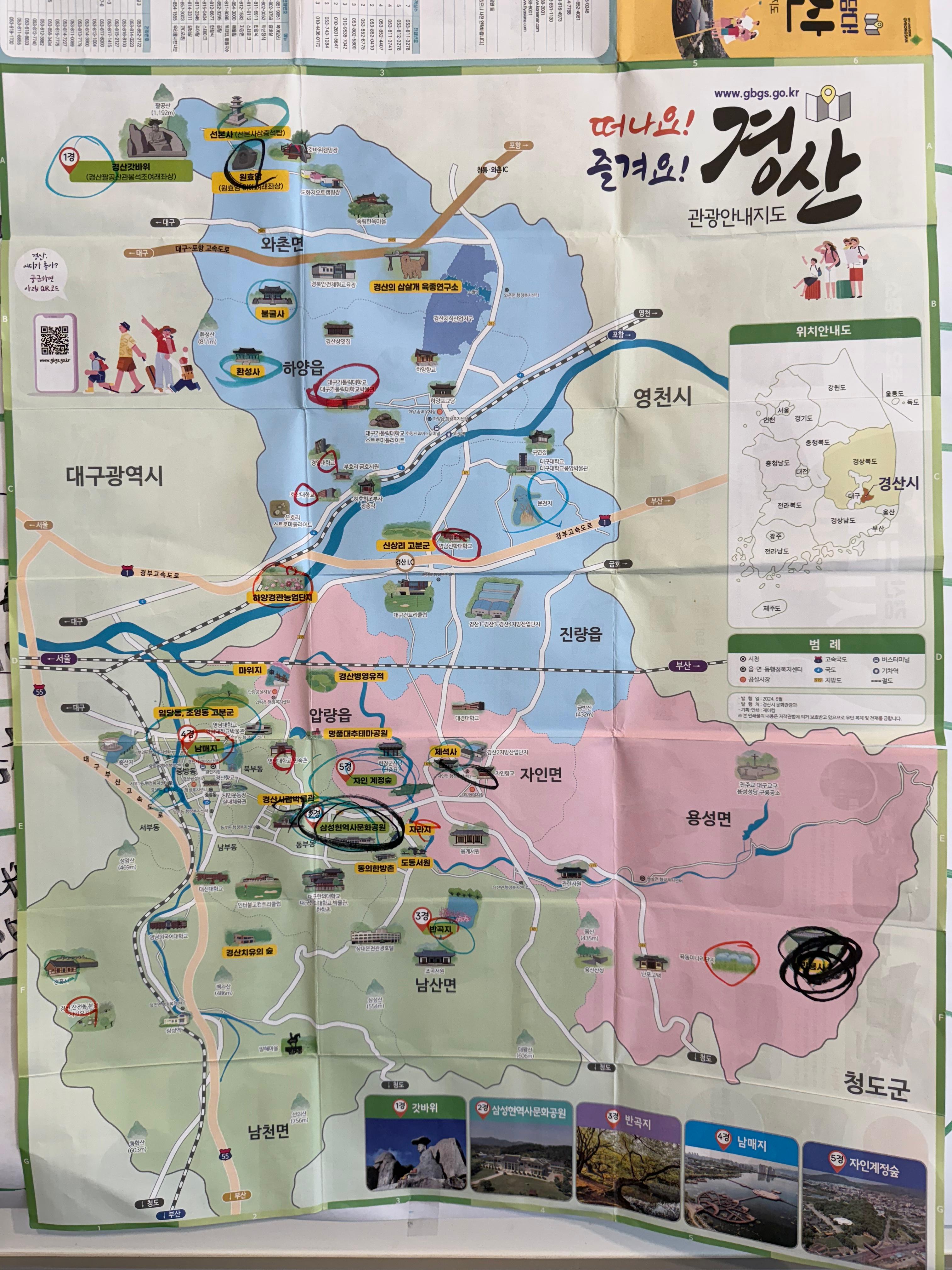 - 경산시 관광 지도에서 팀별 릴레이로 주제별 지명 찾기 : 삼성현의 도시로 관련 5곳, 대학 도시로서 대학 6곳, 옛 유적지로 사찰 6곳, 연못이 많아 연못 6곳
