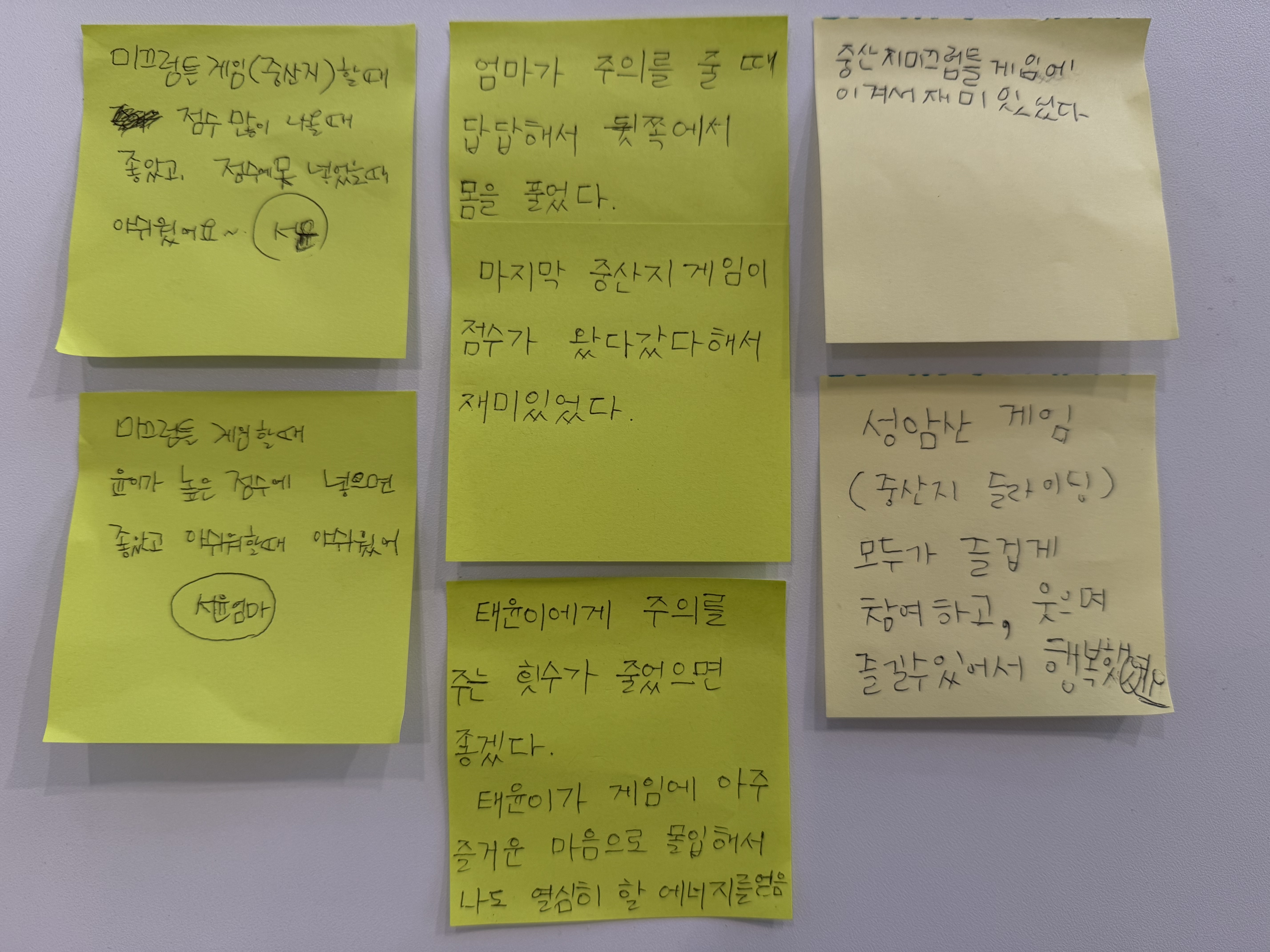 .미끄럼틀 게임할 때 (세 명의)윤이가 높은 점수에 넣으면 좋았고, 아쉬워할 때 아쉬었어(서윤엄마)