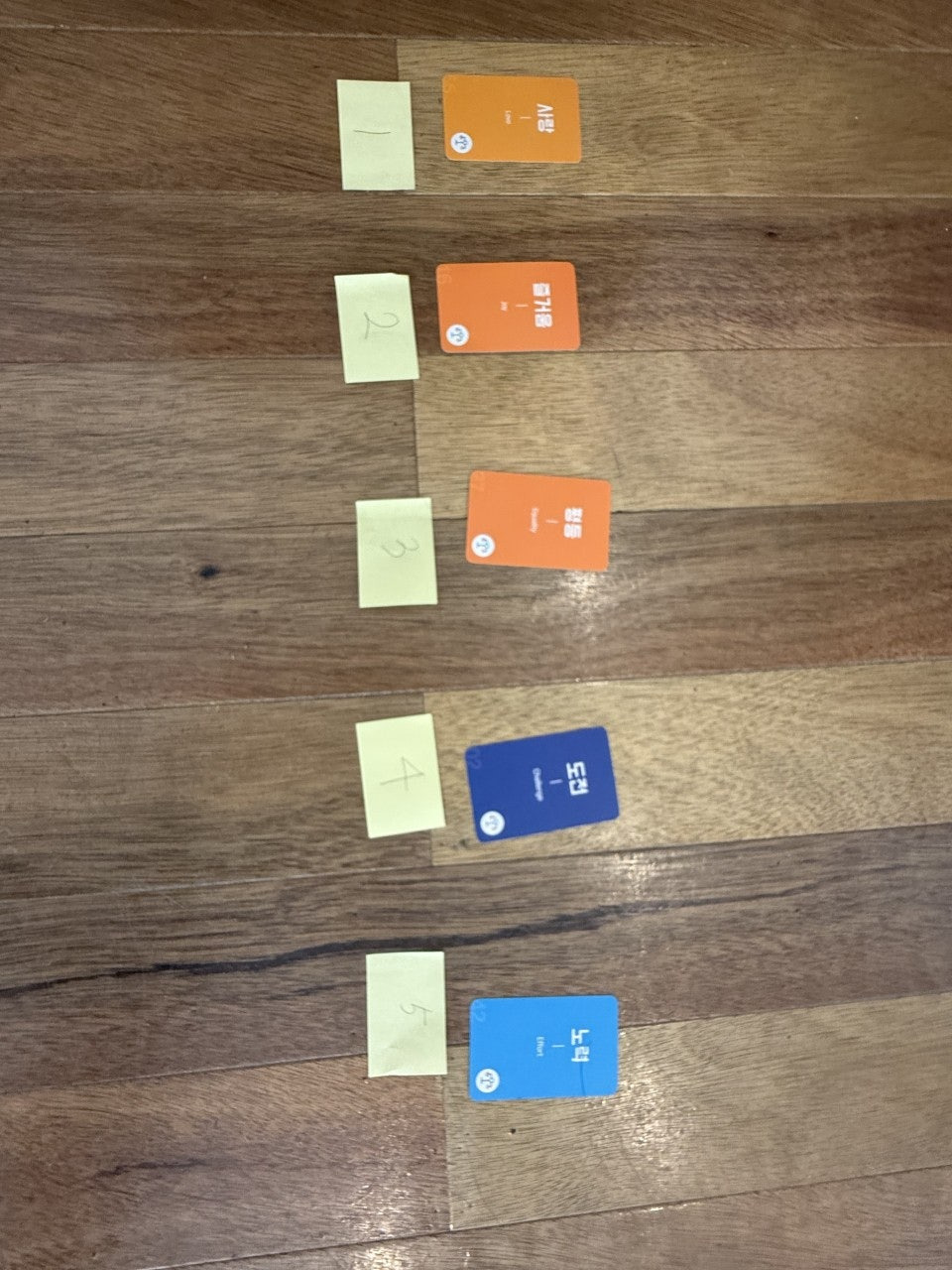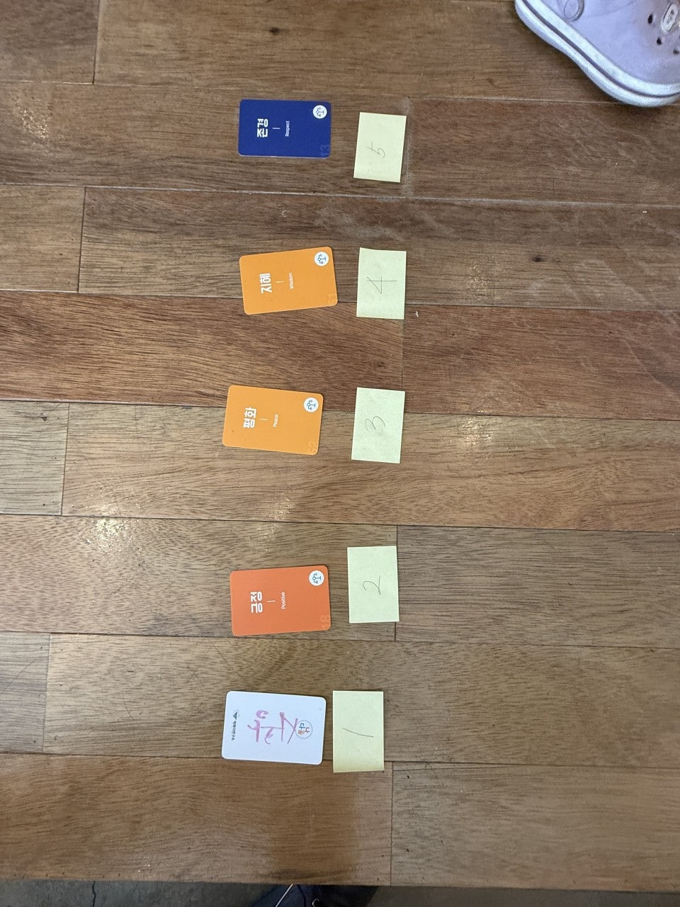 - 팀별 가치카드 순위맞추기 : 가치카드를 섞고 1~6번까지 몇 번에 순위를 배열한 후 맞은 개수를 알려주면서 순위 추론하기