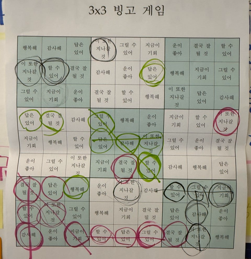 - 3X3 빙고 : 낙관적인 말 9가지를 3x3x3 27개로 랜덤 배치한 후에 룰렛을 돌려 해당 말이 나온 곳을 색칠하면 먼저 빙고만들기 놀이 (이 또한 지나갈 것, 그럴 수 있어, 지금이 기회, 감사해, 운이 좋아, 답은 있어, 결국 잘 될 것, 할 수 있어, 행복해)