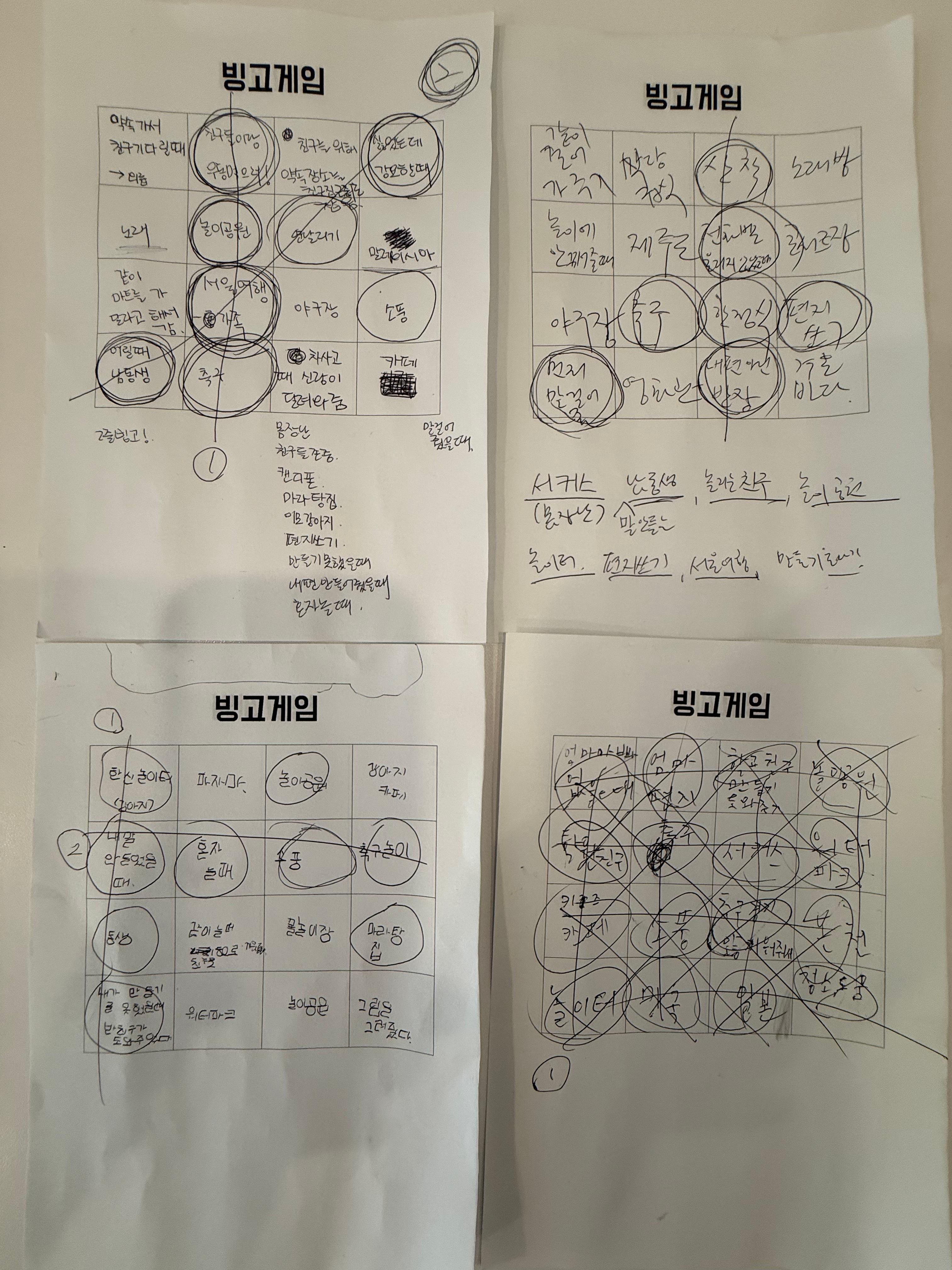 - 토킹 : 페이지별 상황에 따른 빙고 칸 작성하고 빙고놀이하기(우연히 사람을 만난 일, 친구와 함께 한 일, 친구에게 뭔가 해 준 일/받은 일, 섭섭한 일, 함께 가고 싶은 곳 등)