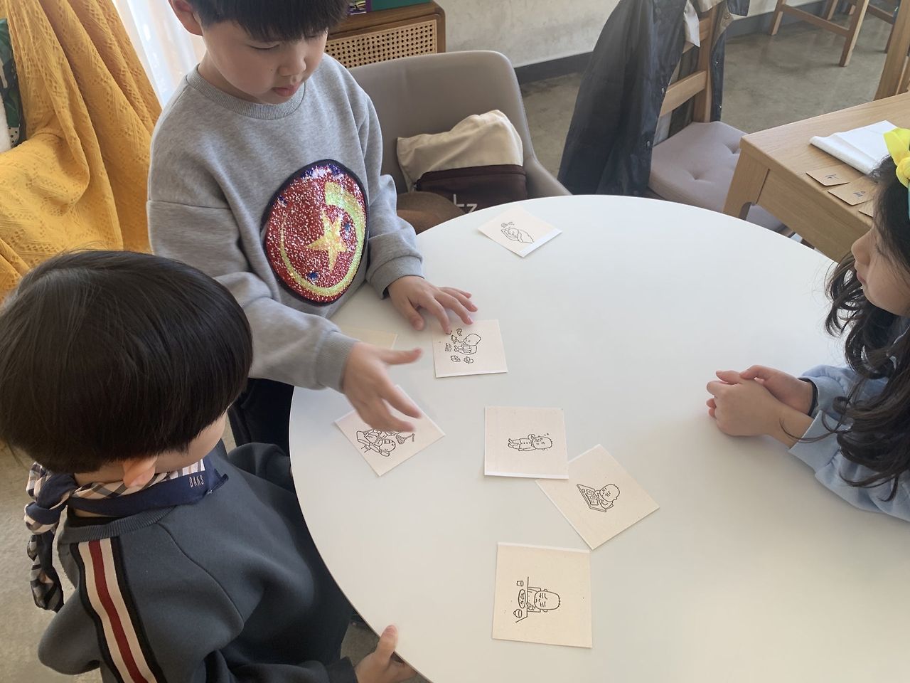 3장의 네임카드에 자신의 이름을 한 글자씩 써서, 전체를 섞어 한 명당 3장씩 나눠주기, 가위바위보를 통해 진 사람은 자신의 카드를 다 보여주고, 서로 1장씩 뽑아서 자기 이름 완성하기
