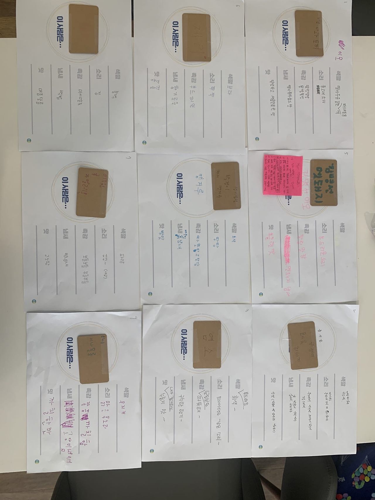 참여자들의 이름을 랜덤으로 뽑아서 각 참여자들에 대한 인상을 오감으로 표현(색깔, 소리, 촉감, 맛, 냄새)한 뒤에 9명을 내용을 소개하고, 누구인지 맞추는 놀이를 진행. 작성한 내용 중에서 나다운 것과 다른 것을 서로 이야기 나눔