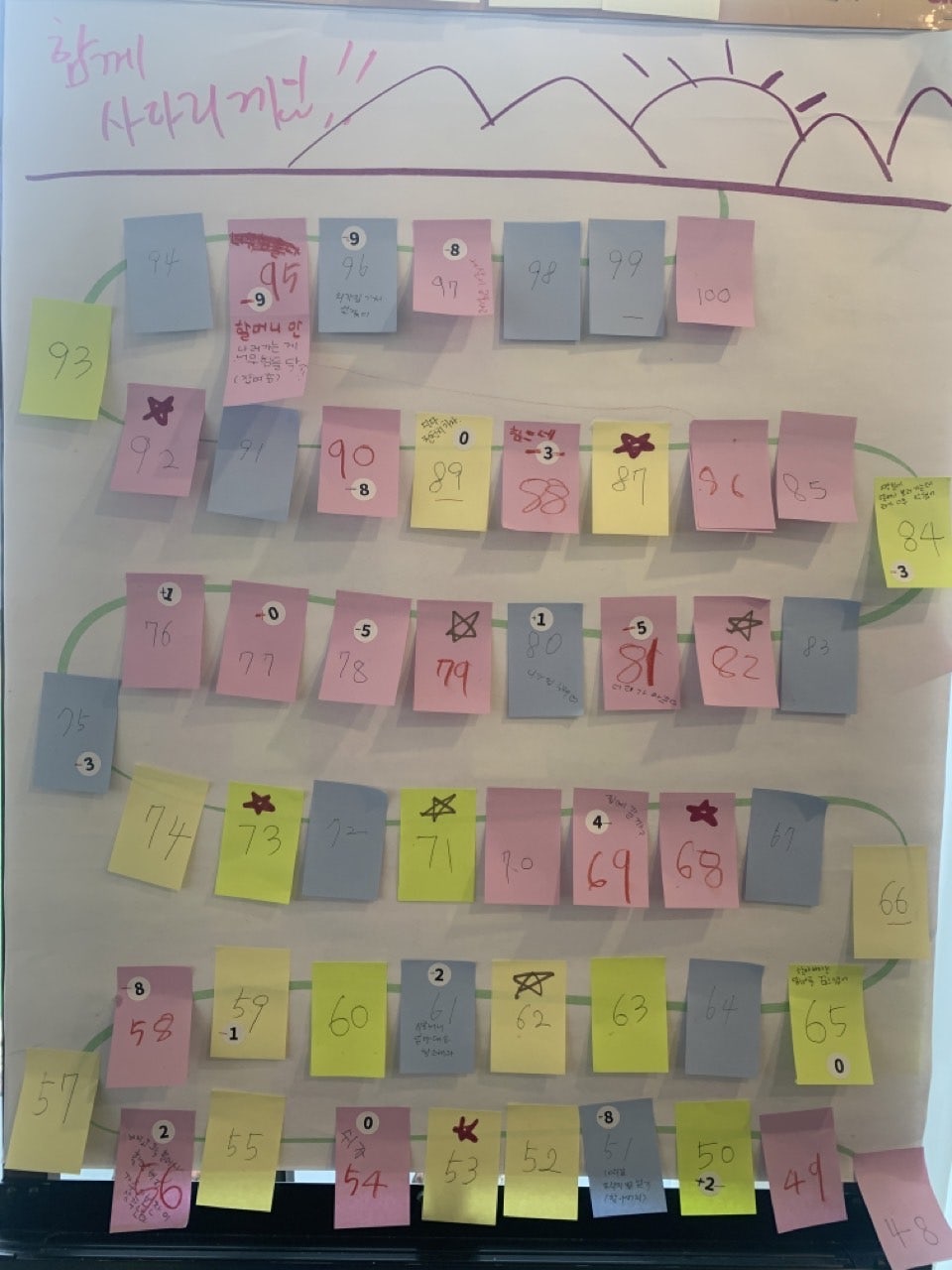 - 1~100번의 카드를 랜덤으로 5명에게 20장씩 배포하고 포스트잇에 부여