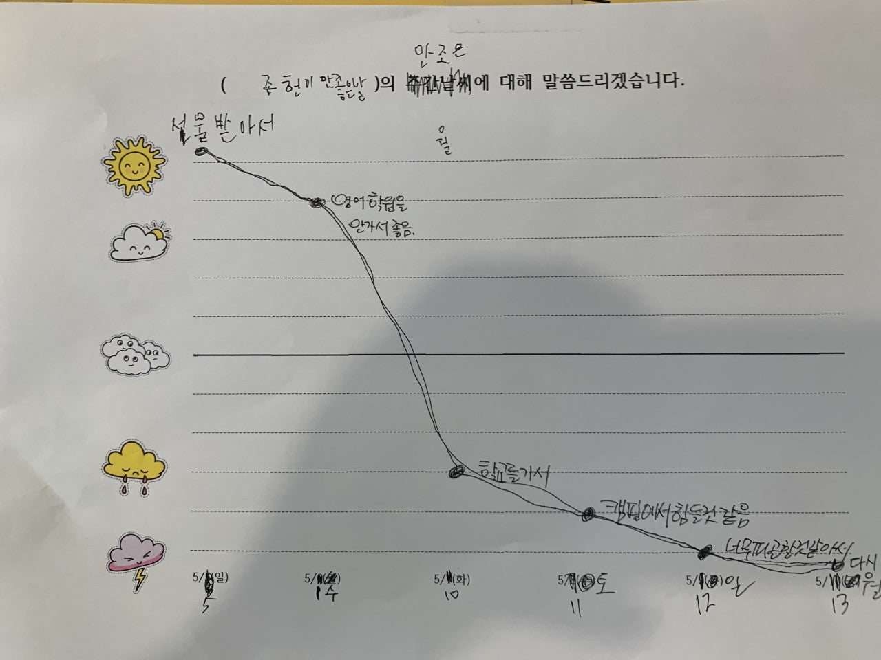 - 참여자의 1주일 동안의 일들을 주간날씨로 기상캐스터처럼 발표하기