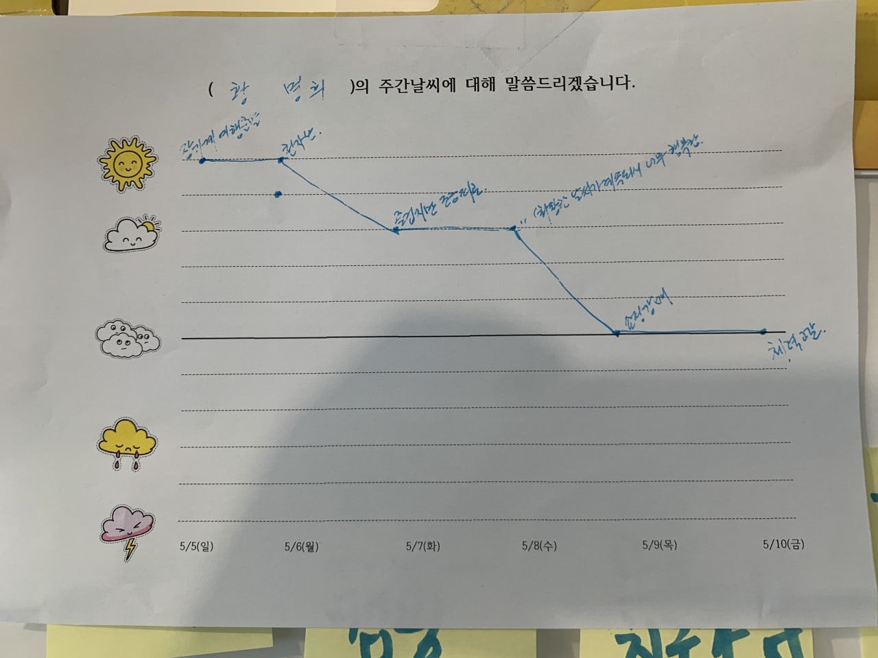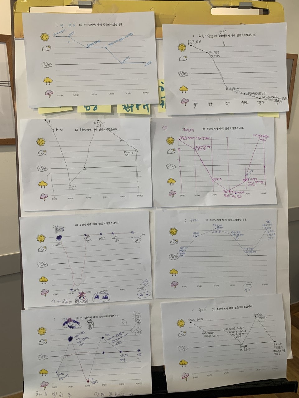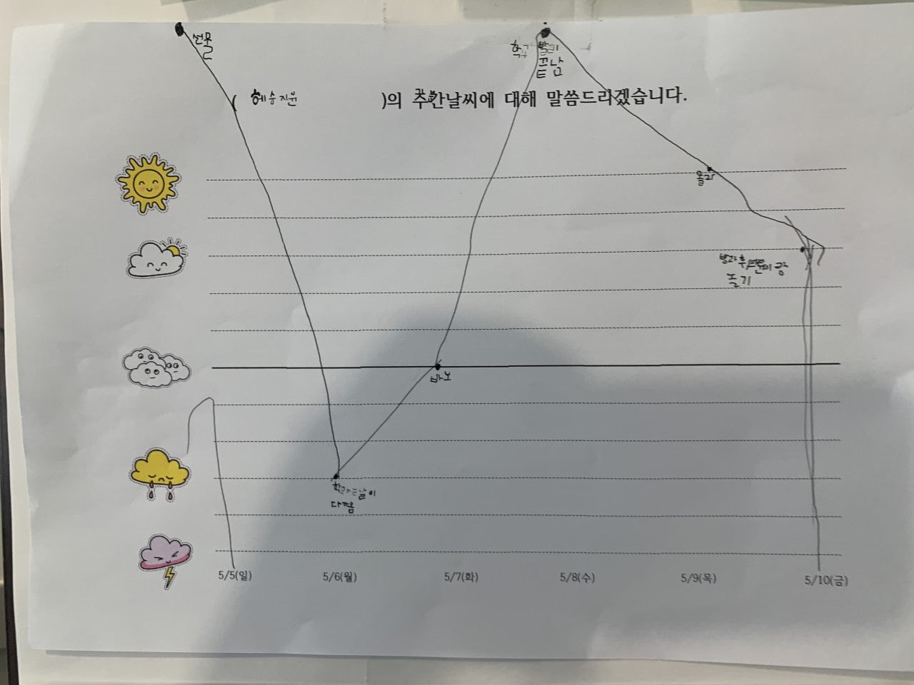 - 참여자의 1주일 동안의 일들을 주간날씨로 기상캐스터처럼 발표하기