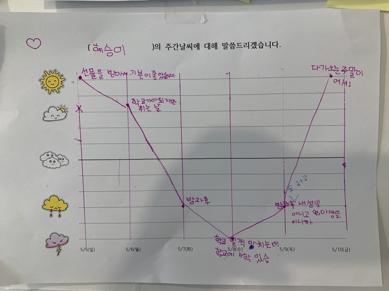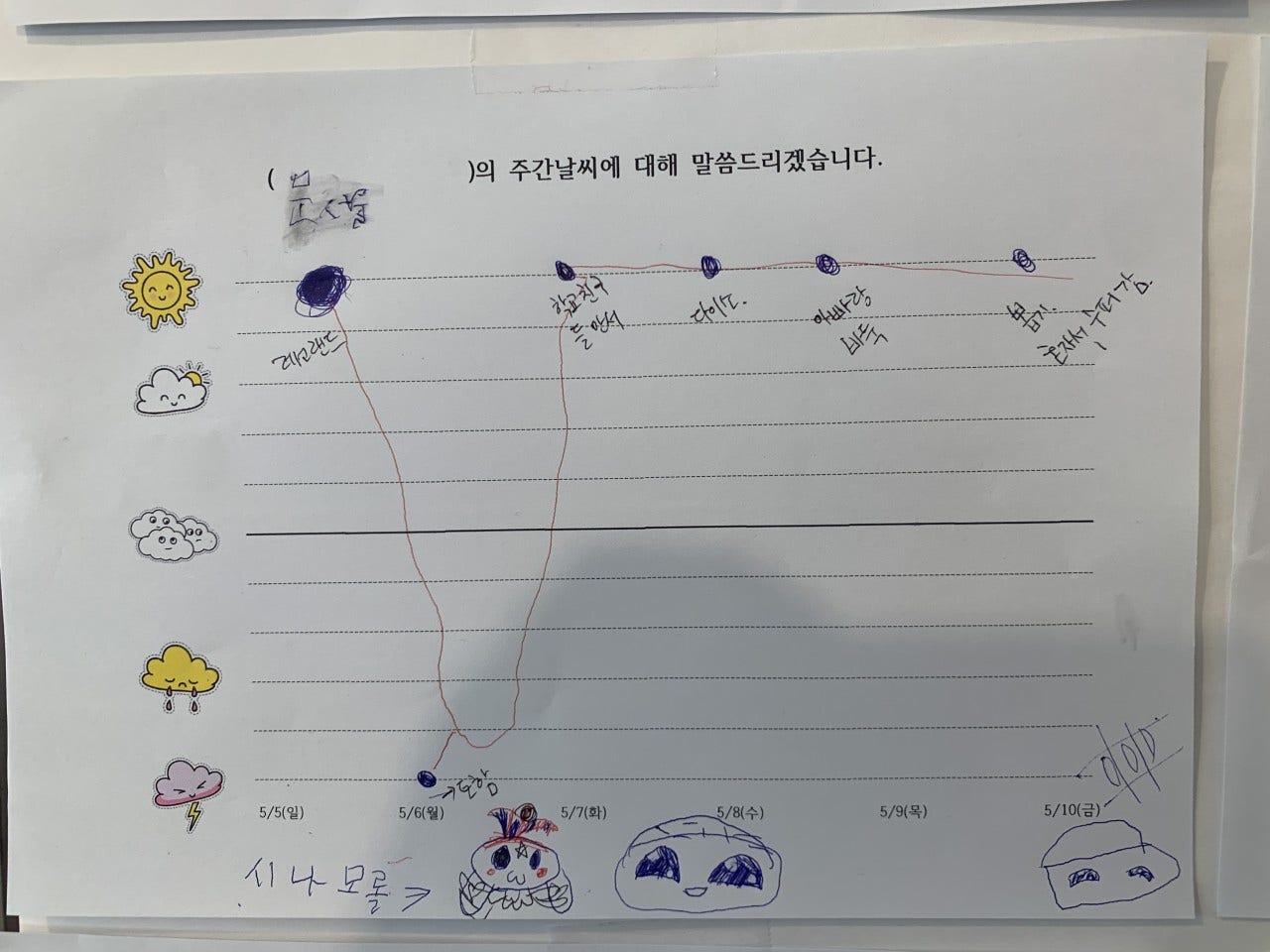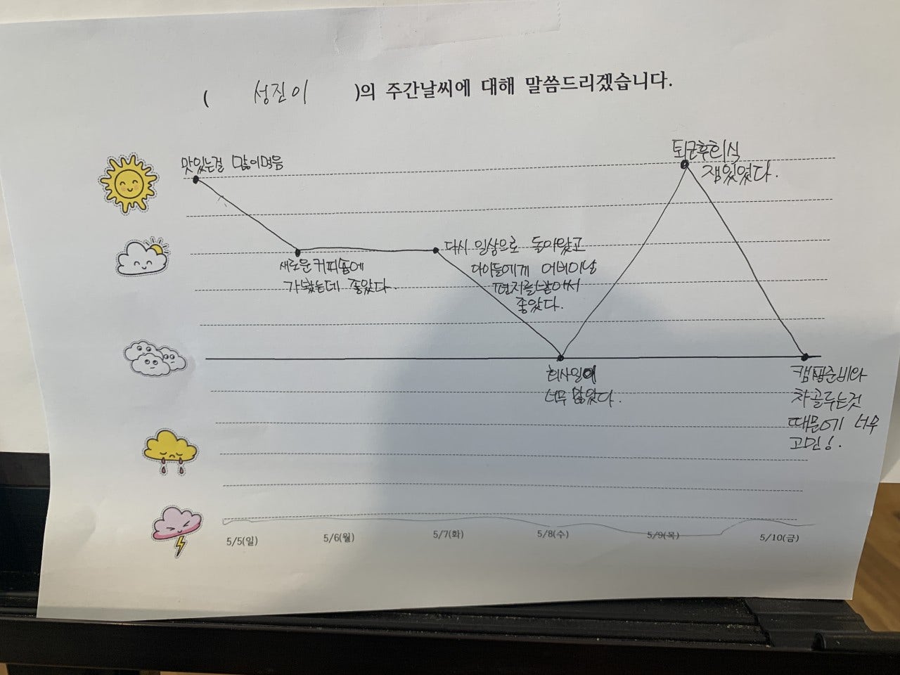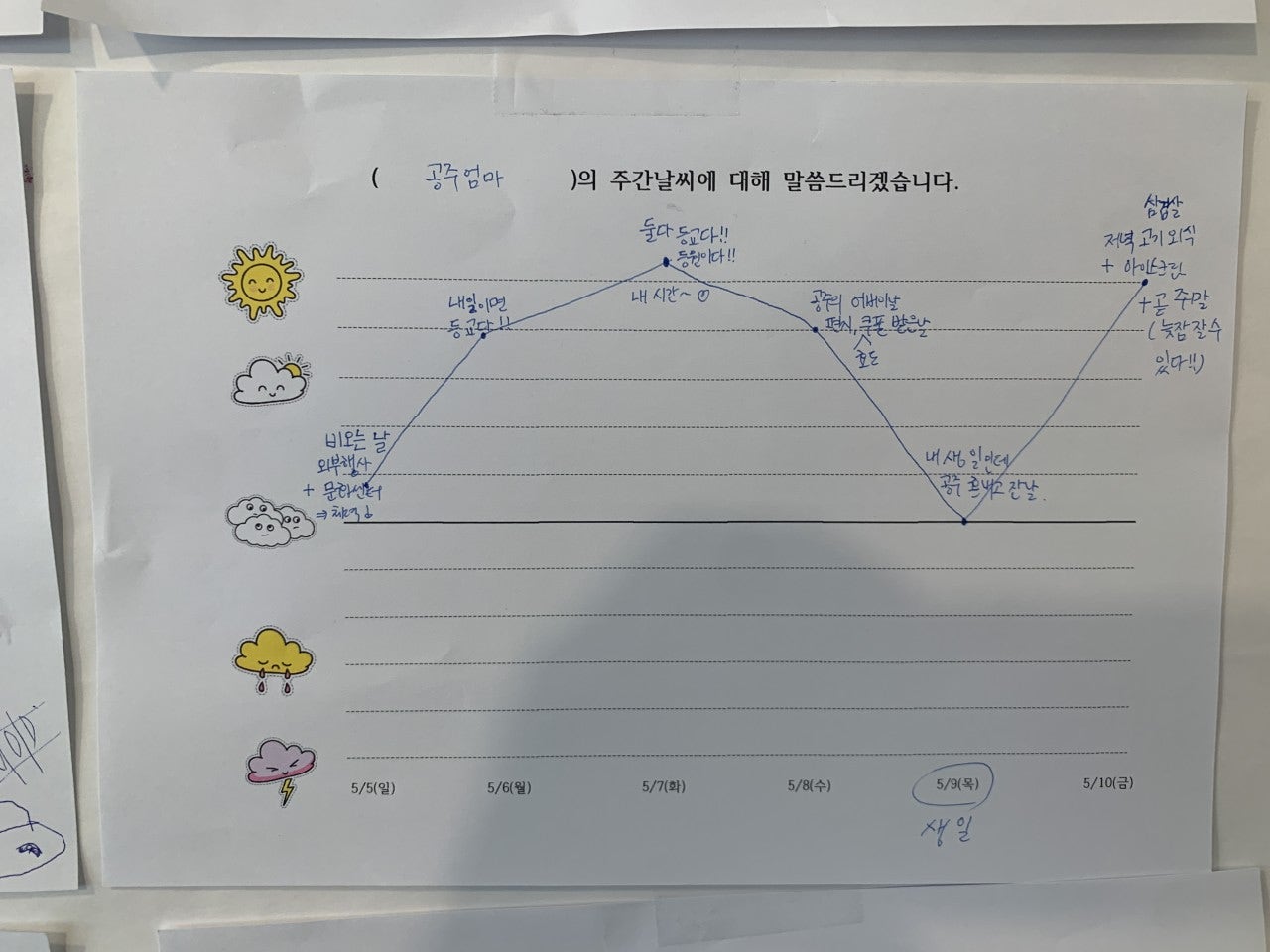 - 참여자의 1주일 동안의 일들을 주간날씨로 기상캐스터처럼 발표하기