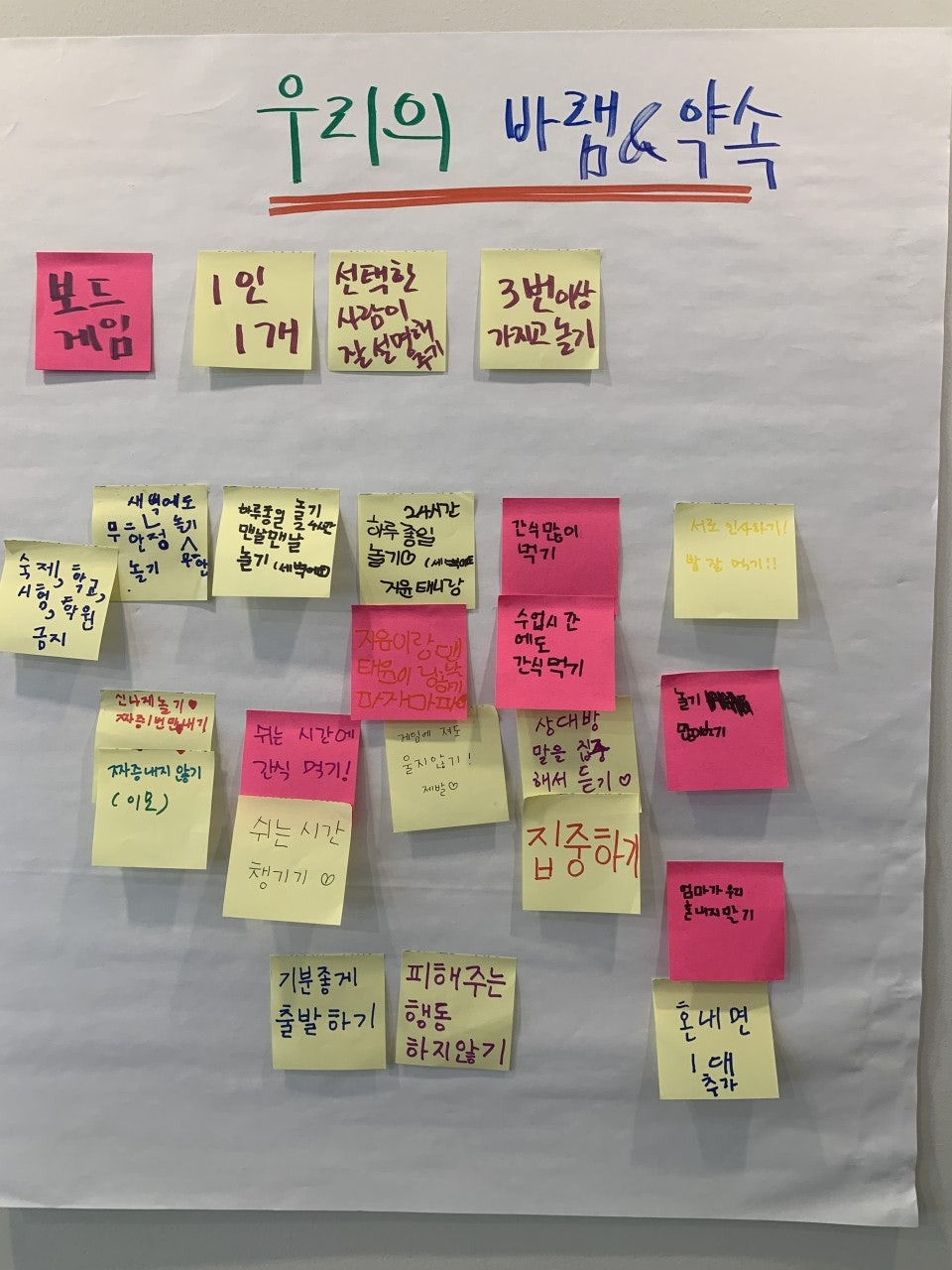 - 보드게임 : 1인 1개 선택, 선택한 사람이 잘 설명하기, 3번 이상 게임