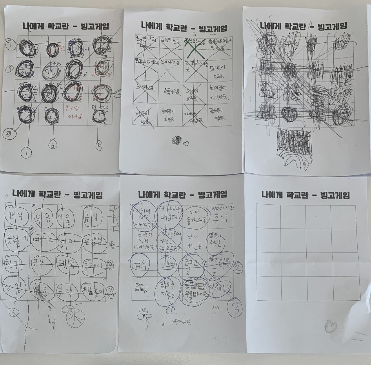 - 학교라고 할 때, 생각나는 것들에 대해 자녀와 부모님이 한 팀이 되어 서로 도와 빙고칸을 채워 빙고게임하기.