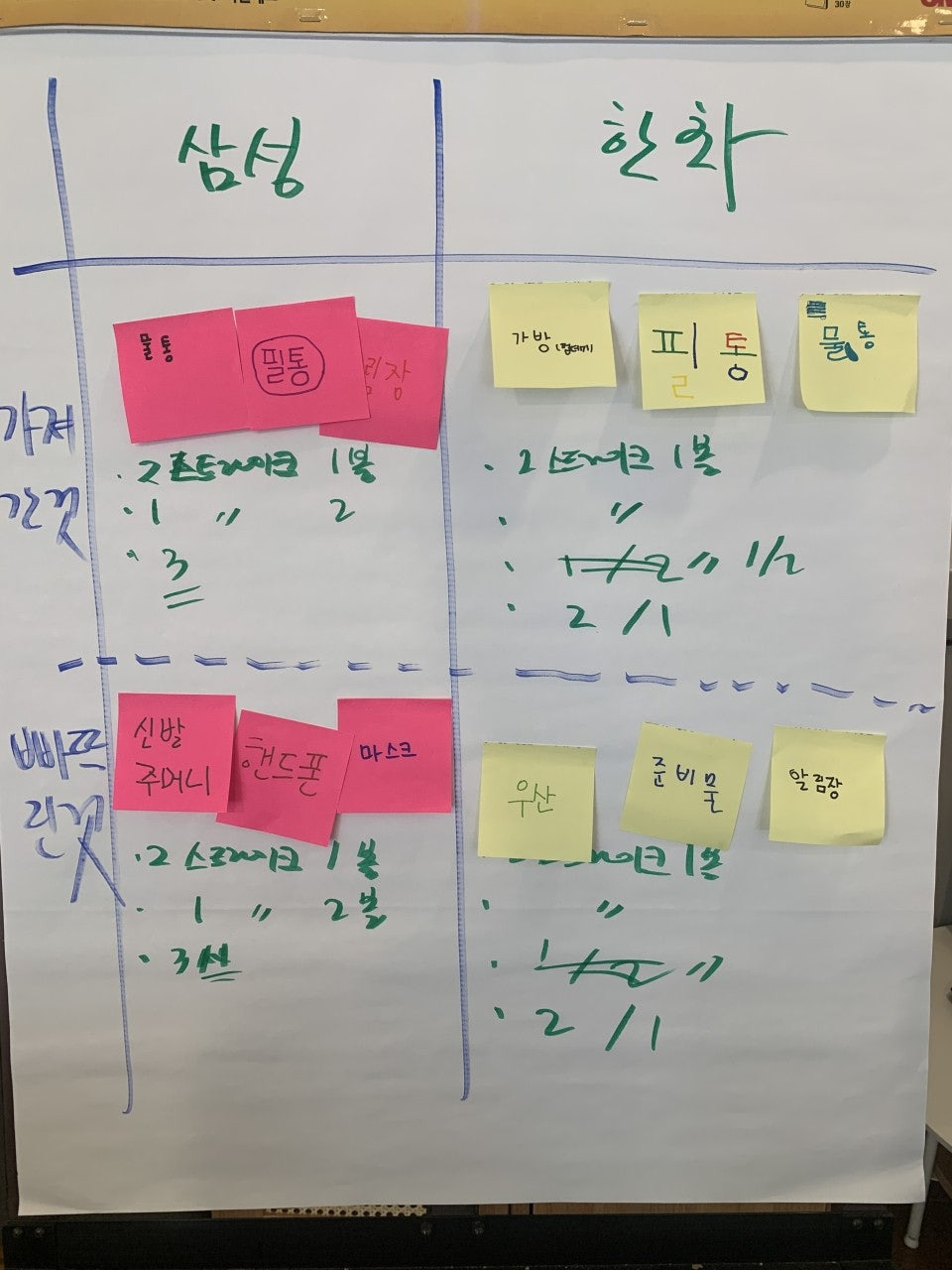 - 학교갈 때 가져가는 것 3가지, 빠뜨리는 것 3가지로 2쌍을 만들어 섞은 다음, 상대팀에서 2가지 종류를 찾는 게임