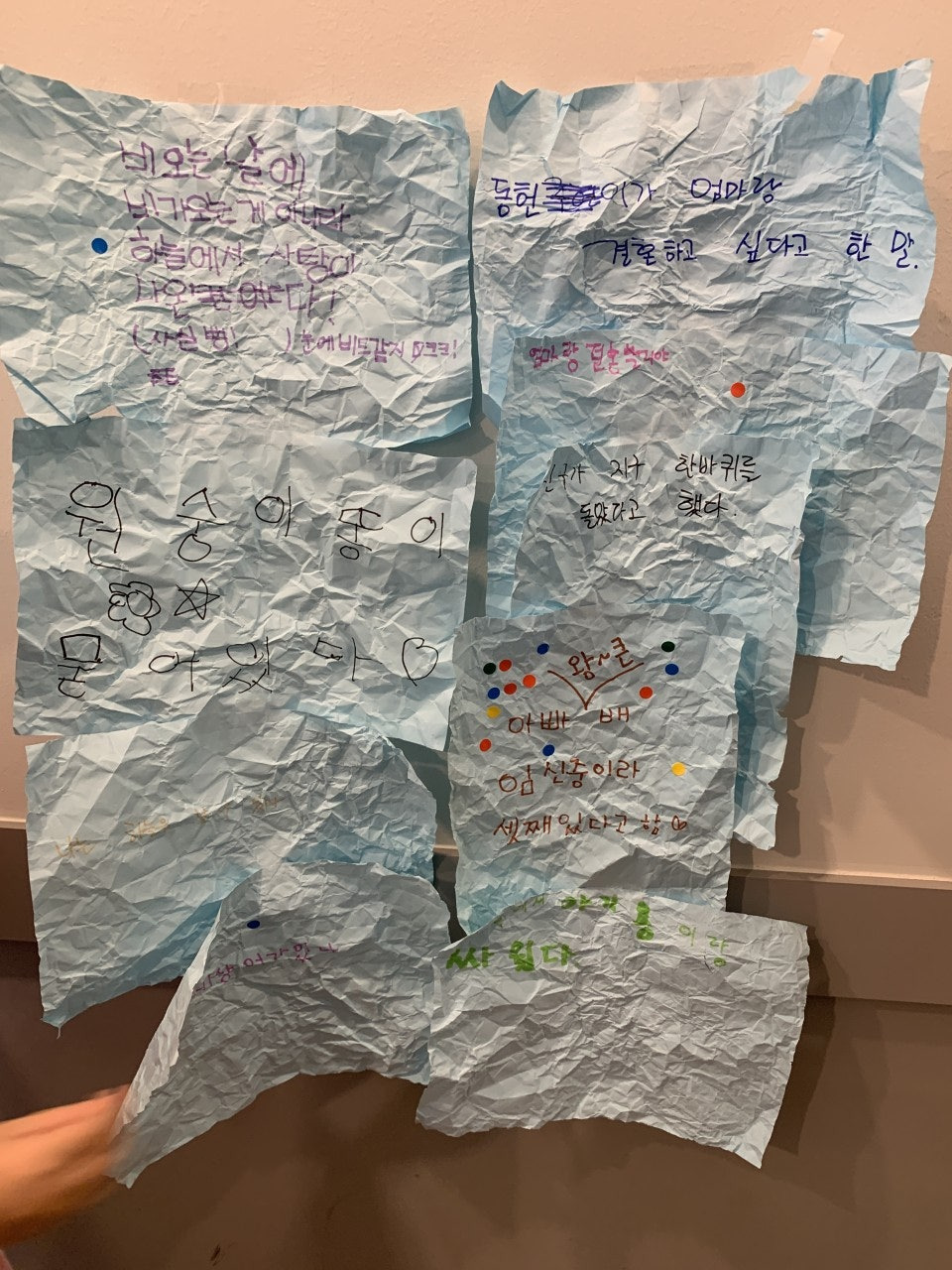 - 색상별로 작성할 때마다 공처럼 구겨서 제출하고, 랜덤으로 배정해서, 다시 작성해서 그 위에 공을 만들어 제출하고, 또 랜덤으로 배정해서 마지막으로 적상한 후 그 위에 공을 만들어 ⇒ 랜덤으로 뽑아서 내용 읽고 공유하기 ⇒ 공감투표하기