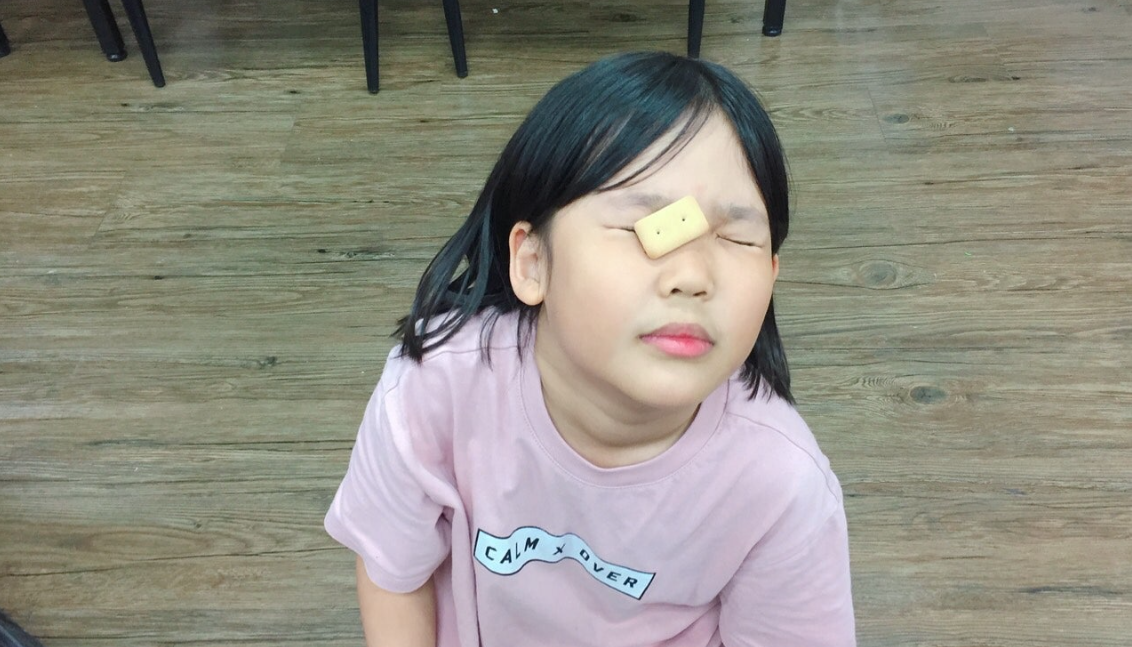 - 이마 위에 과자를 올립니다.