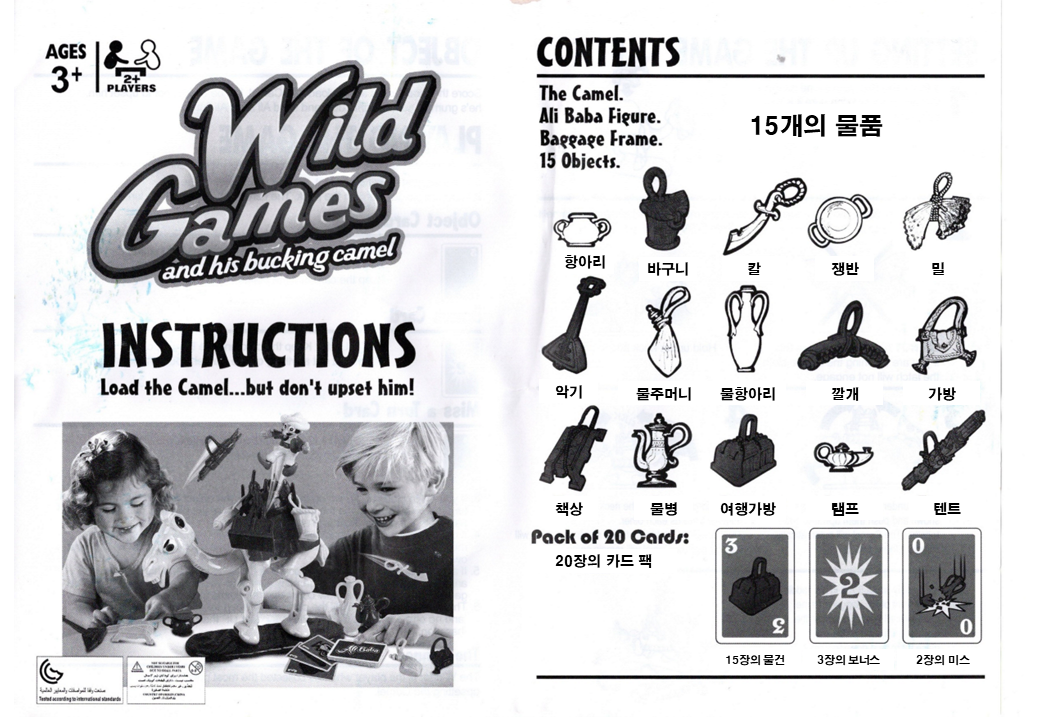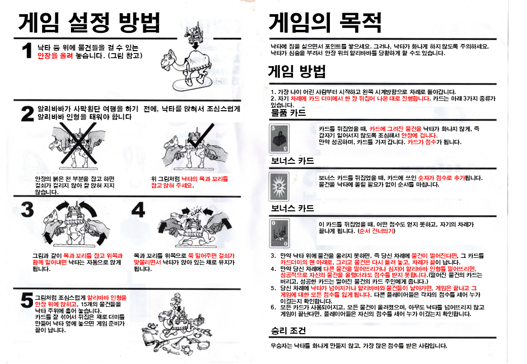 낙타의 안장에 번갈아가면서 카드를 뽑고 카드에 그려진 물품을 안장에 싣는 게임입니다.