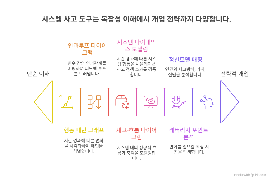 이를 위해 다양한 분석 도구가 개발되었으며, 이들은 문제 구조의 인식 → 관계 탐색 → 시뮬레이션 → 전략적 개입 설계의 흐름으로 활용됩니다.