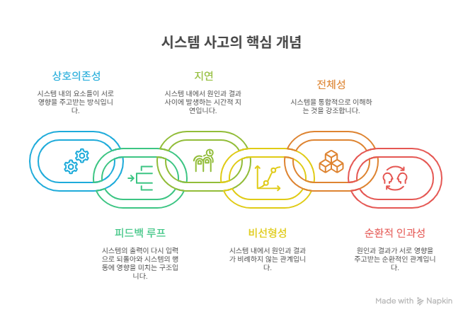 즉, 시스템사고는 “부분의 합으로 전체를 설명할 수 없다”는 전제에서 출발하며, **전체성(holism)**과 **순환적 인과성(circular causality)**을 강조한다.