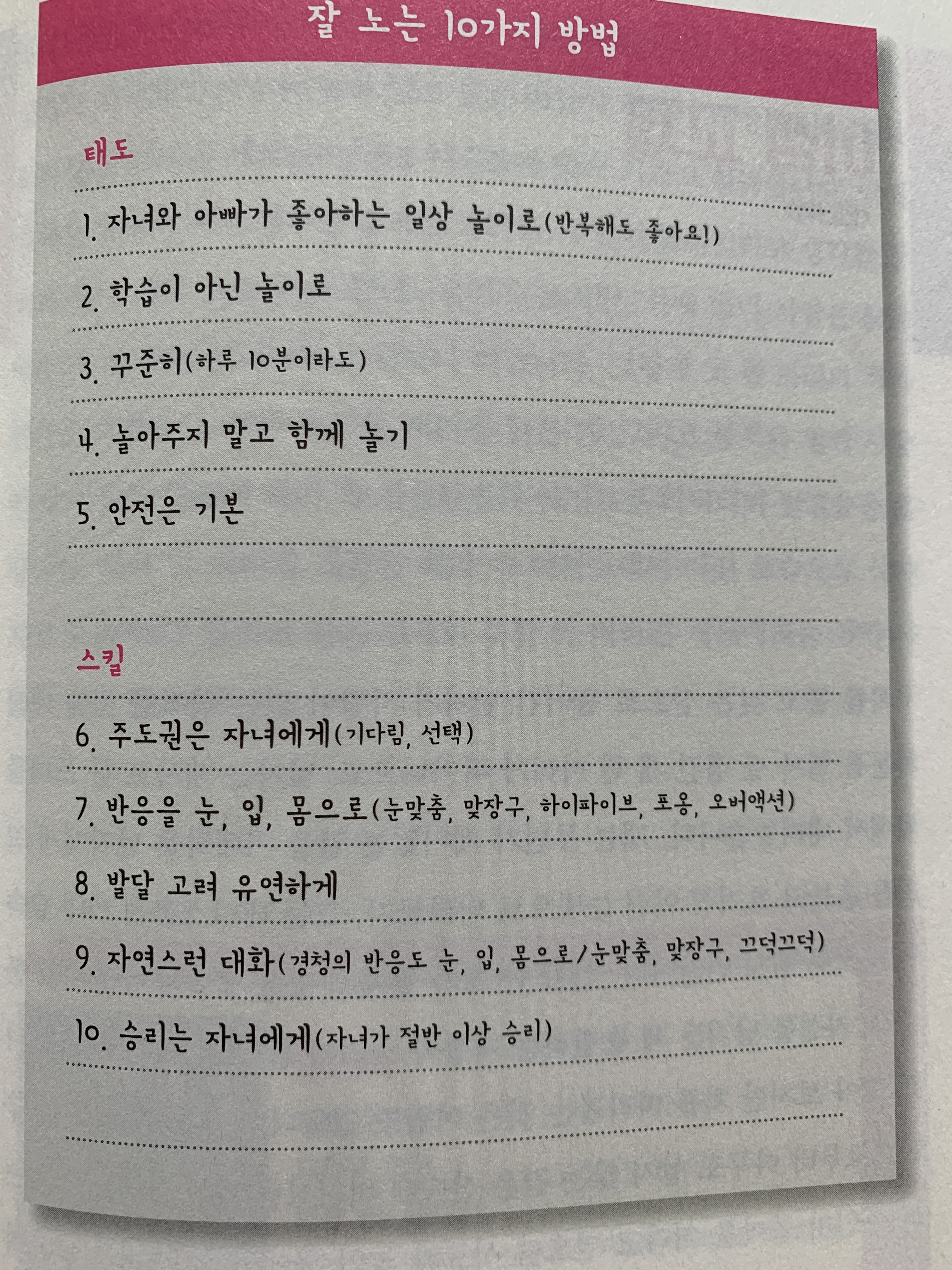자녀와 잘 노는 10가지 방법으로 자녀와 아빠가 좋아하는 일상 놀이, 학습이 아닌 놀이, 꾸준한 놀이, 놀아주지 말고 함께 놀기, 안전한 놀이, 주도권은 자녀에게, 반응을 눈맞춤, 맞장구, 하이파이브, 포옹, 오버액션으로, 발달 고려하여 유연하게, 자연스런 대화, 승리는 자녀에게...
