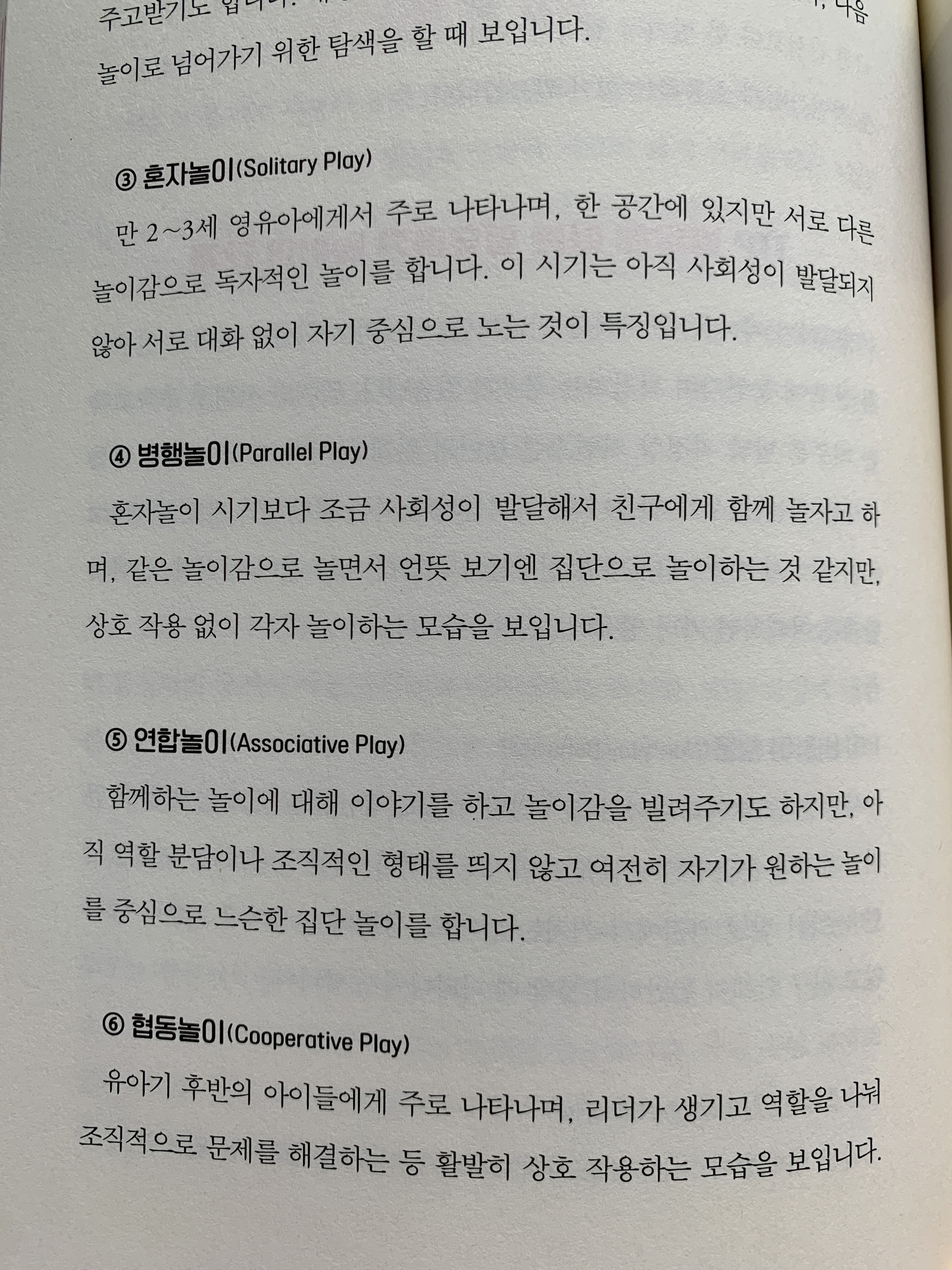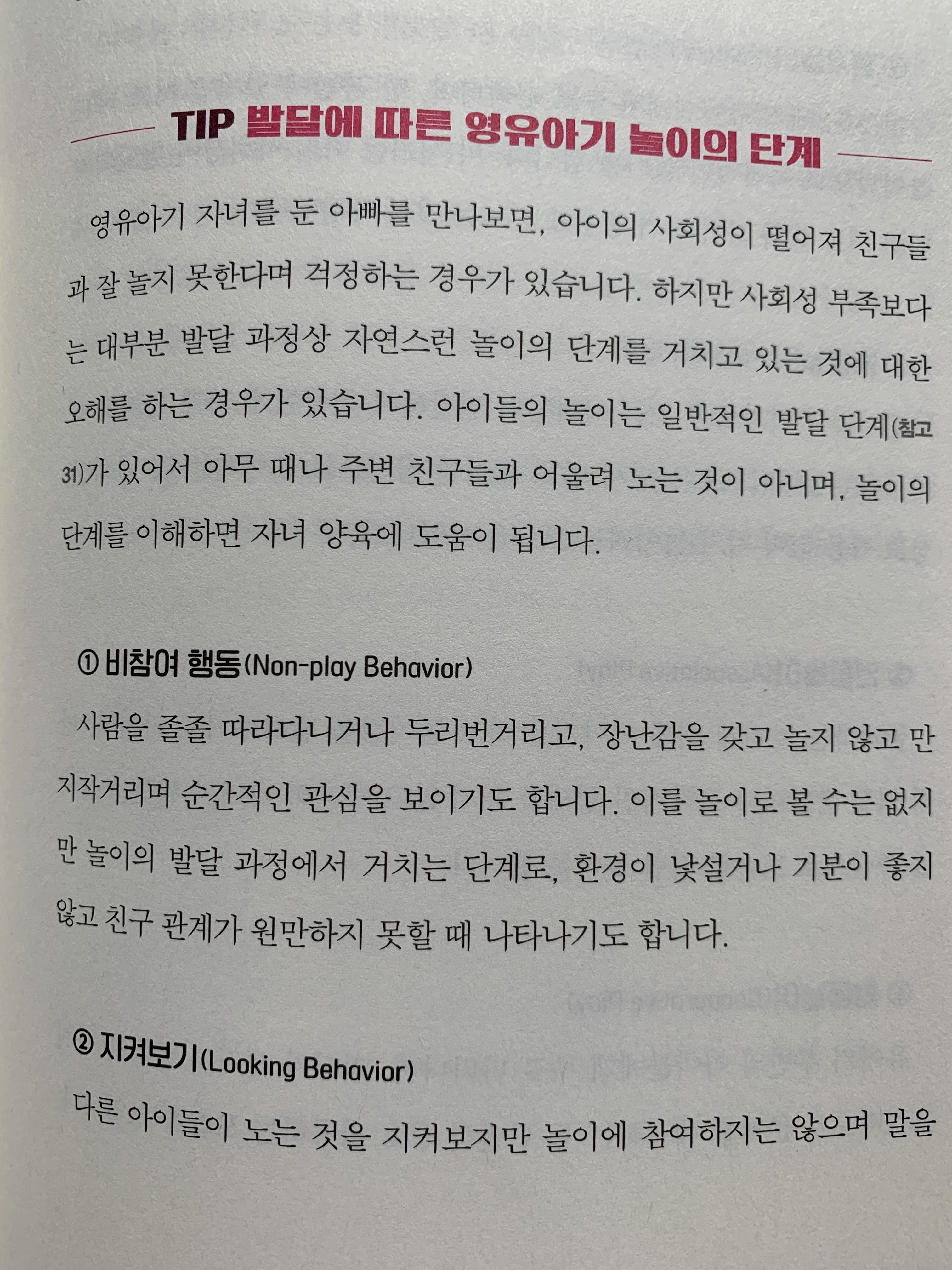 영유아기의 놀이의 단계도 한번 살펴볼 필요가 있을 것 같다. 비참여 행동, 지켜보기, 혼자놀이, 병행놀이, 연합놀이, 협동놀이 등 이 모든 것이 영유아기의 놀이라고 인정하고 지켜볼 필요가 있을 것 같다.