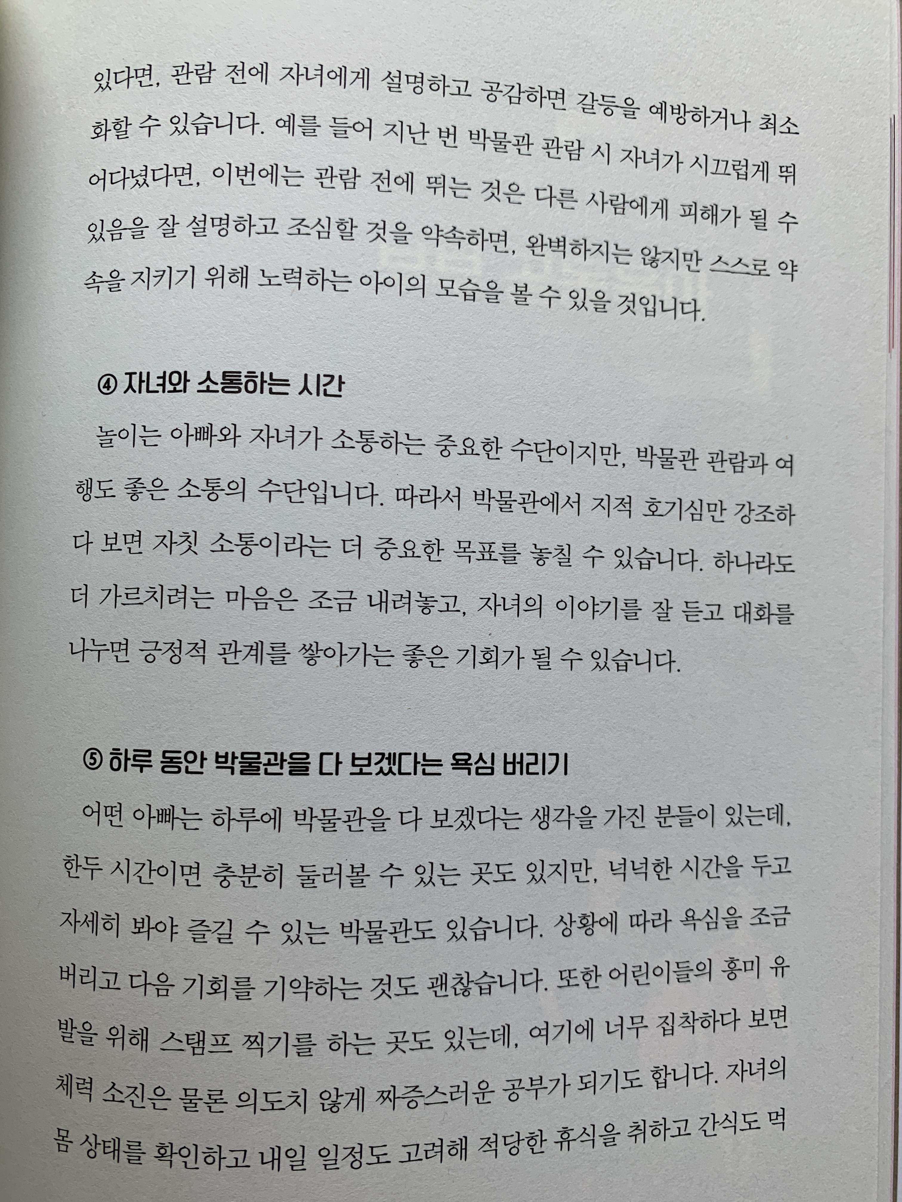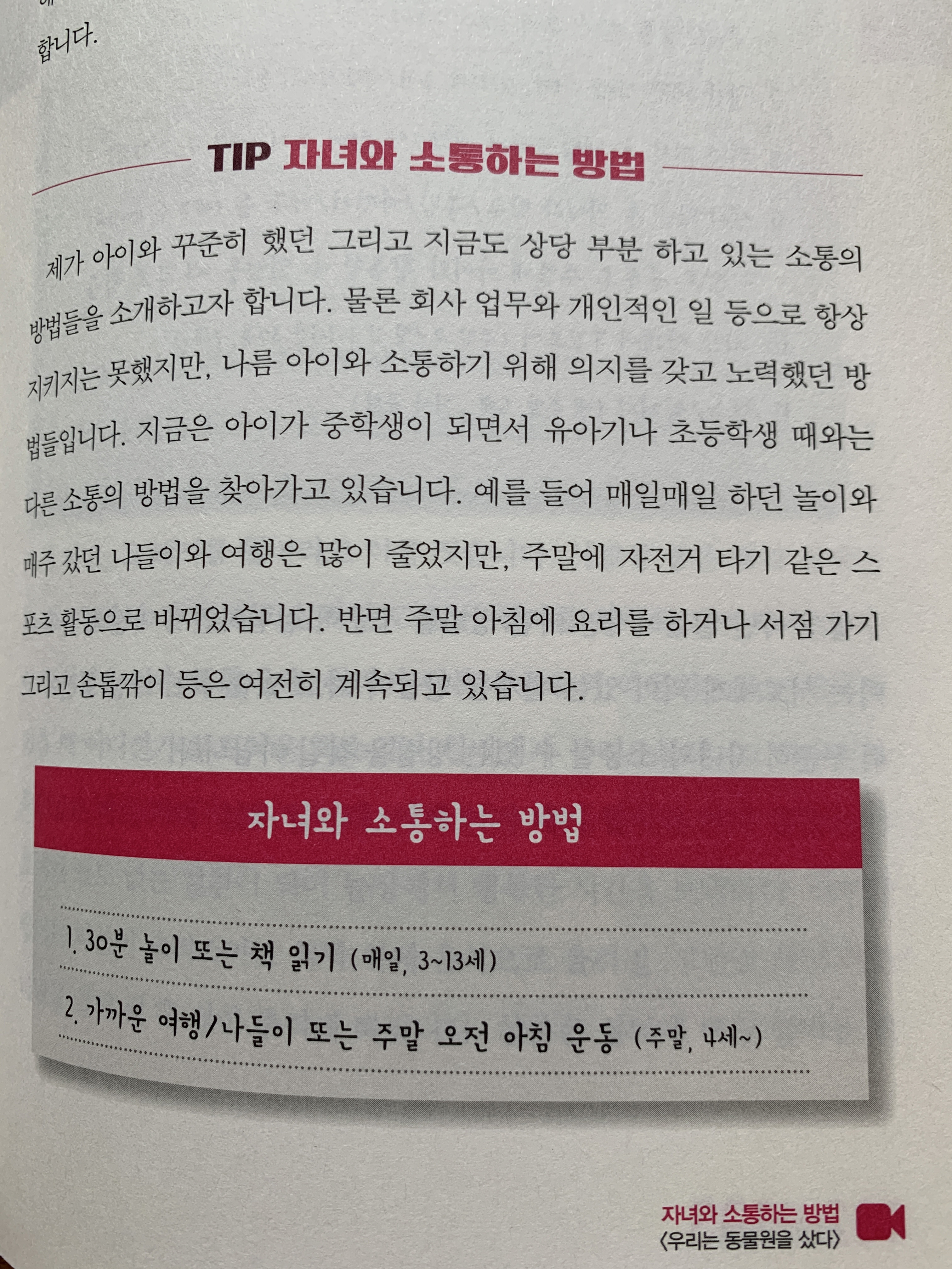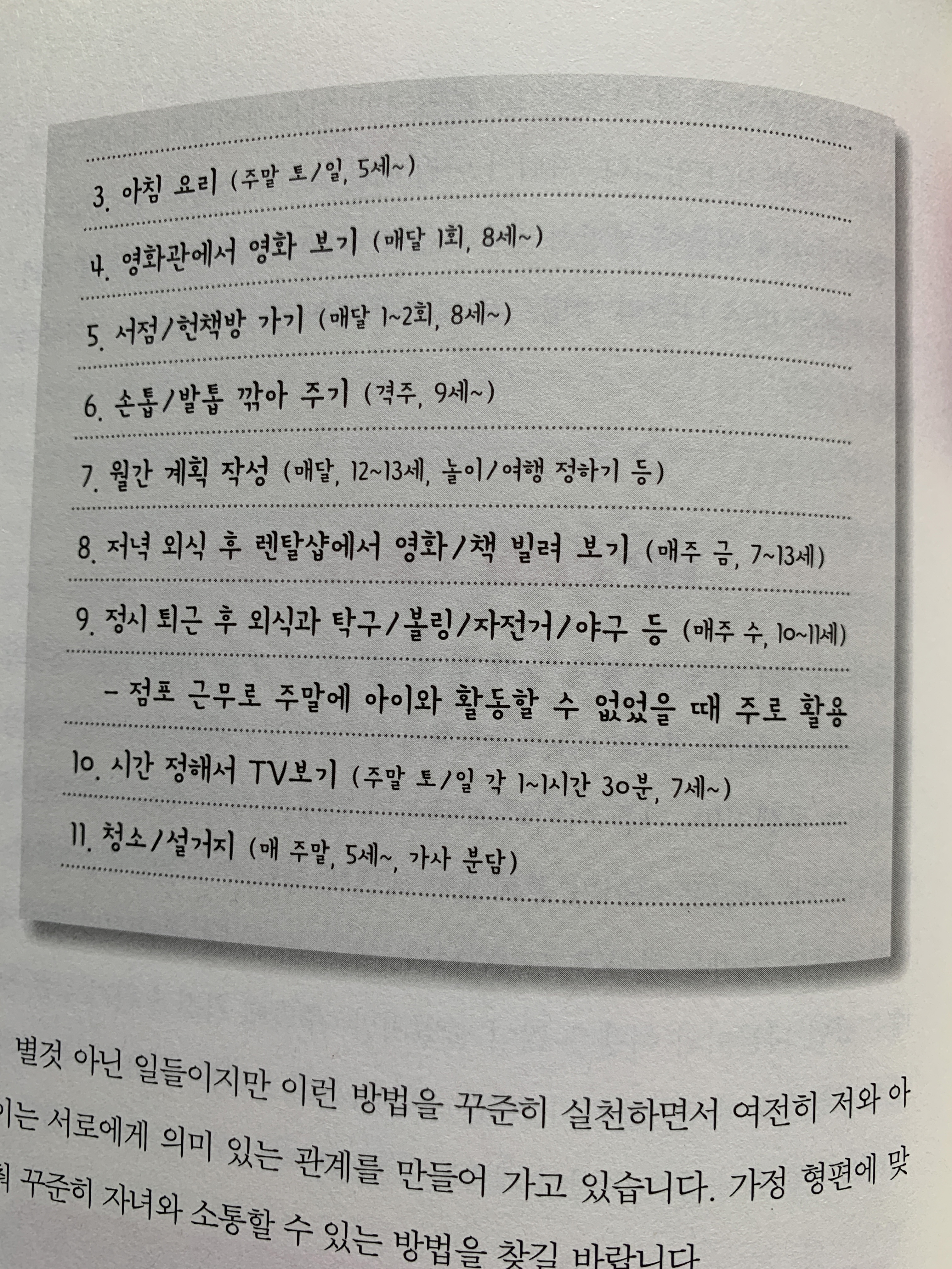 자녀와 소통하는 방법으로 가까운 여행/나들이/주말 오전 아침 운동, 서점/헌책방가기, 월간 계획 작성, 저녁 외식 후 영화/책 빌려보기, 특정 요일을 정한 미션(퇴근 후 운동), 시간정해서 TV보기....