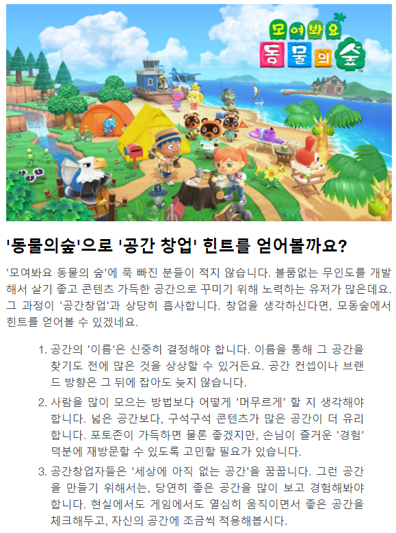 '동물의숲'으로 '공간 창업' 힌트를 얻어볼까요?