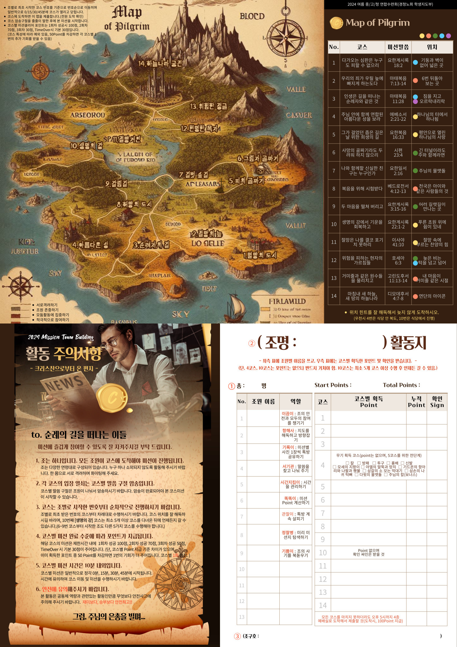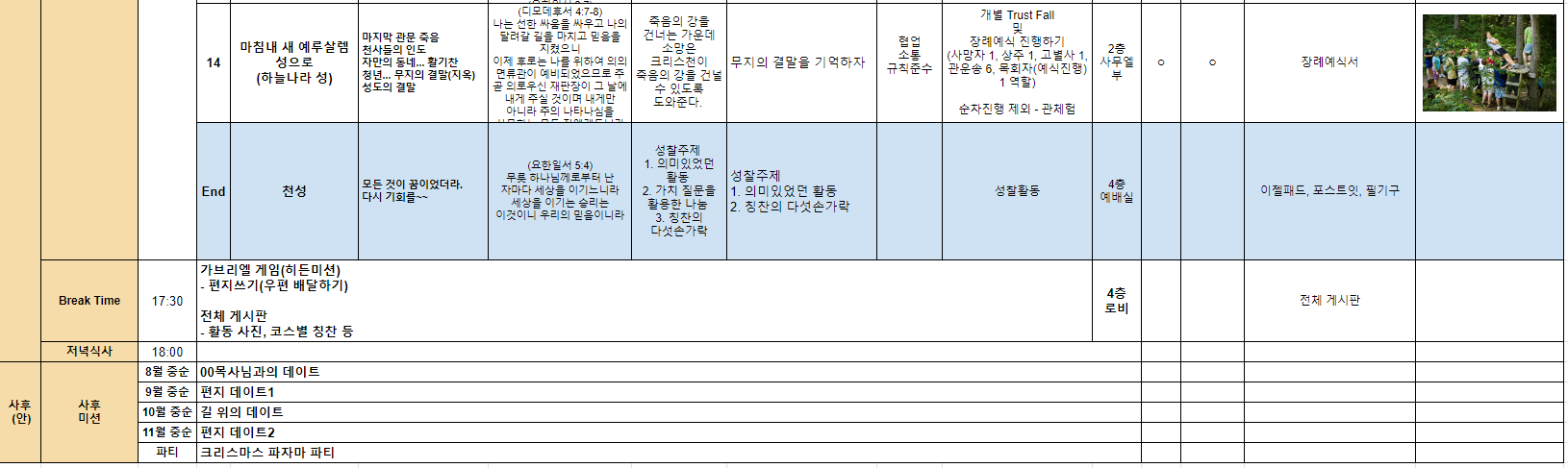 - 내용 : 천로역정 스토리 기반의 조별 액티비티 활동(14코스)과 성찰 진행