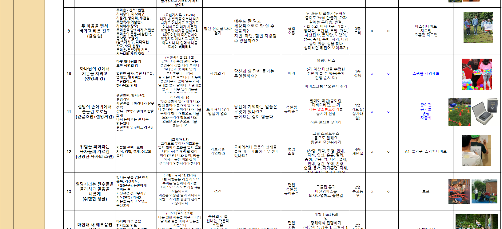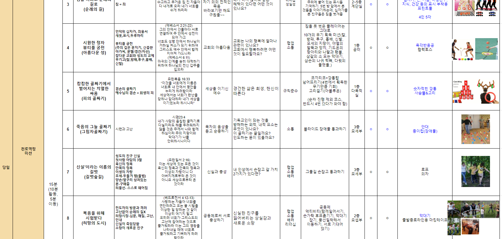 - 천로역정 스토리를 기반으로 14코스 및 말씀구절과 전달가치를 확정