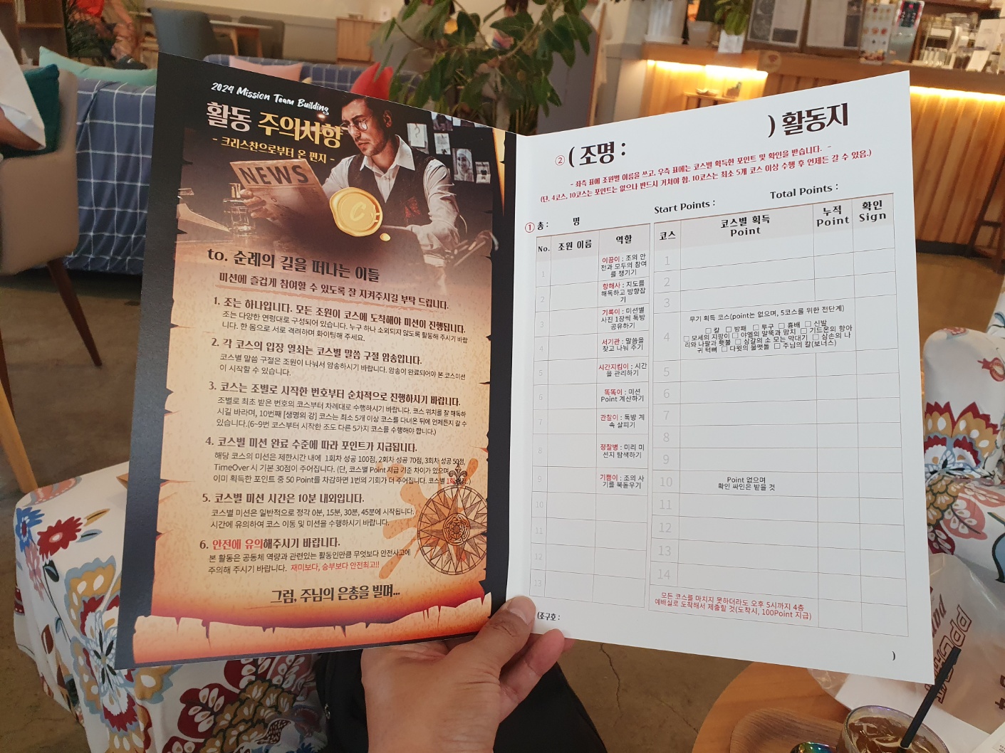 뒤 : 활동 주의사항, 활동지(조명, 조원이름 및 역할, 코스별 획득 포인트 기록)