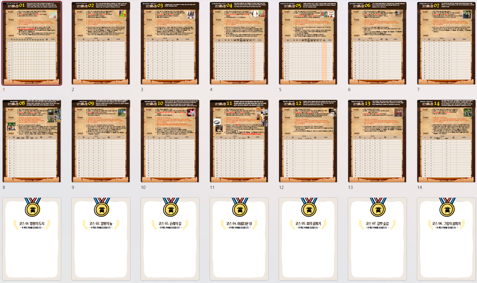 코스명, 코스설명, 관련 성경말씀(미션입장용), 코스준비(목표, 준비물, 준비활동), 코스운영 지시사항, 활동결과 기록, 최고 조/조원 칭찬용 페이지로 구성
