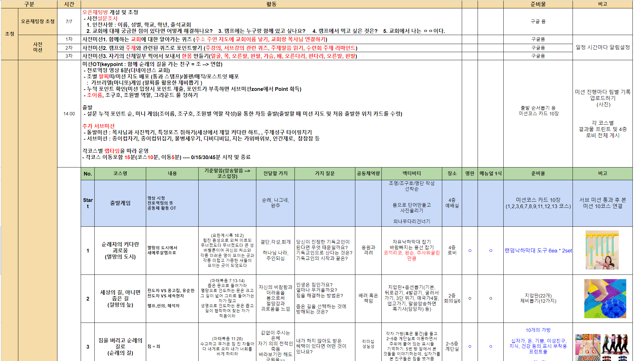 - 내용 : 천로역정 스토리 기반의 조별 액티비티 활동(14코스)과 성찰 진행