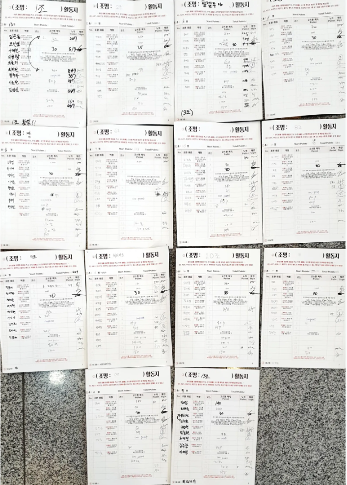 뒤 : 활동 주의사항, 활동지(조명, 조원이름 및 역할, 코스별 획득 포인트 기록)