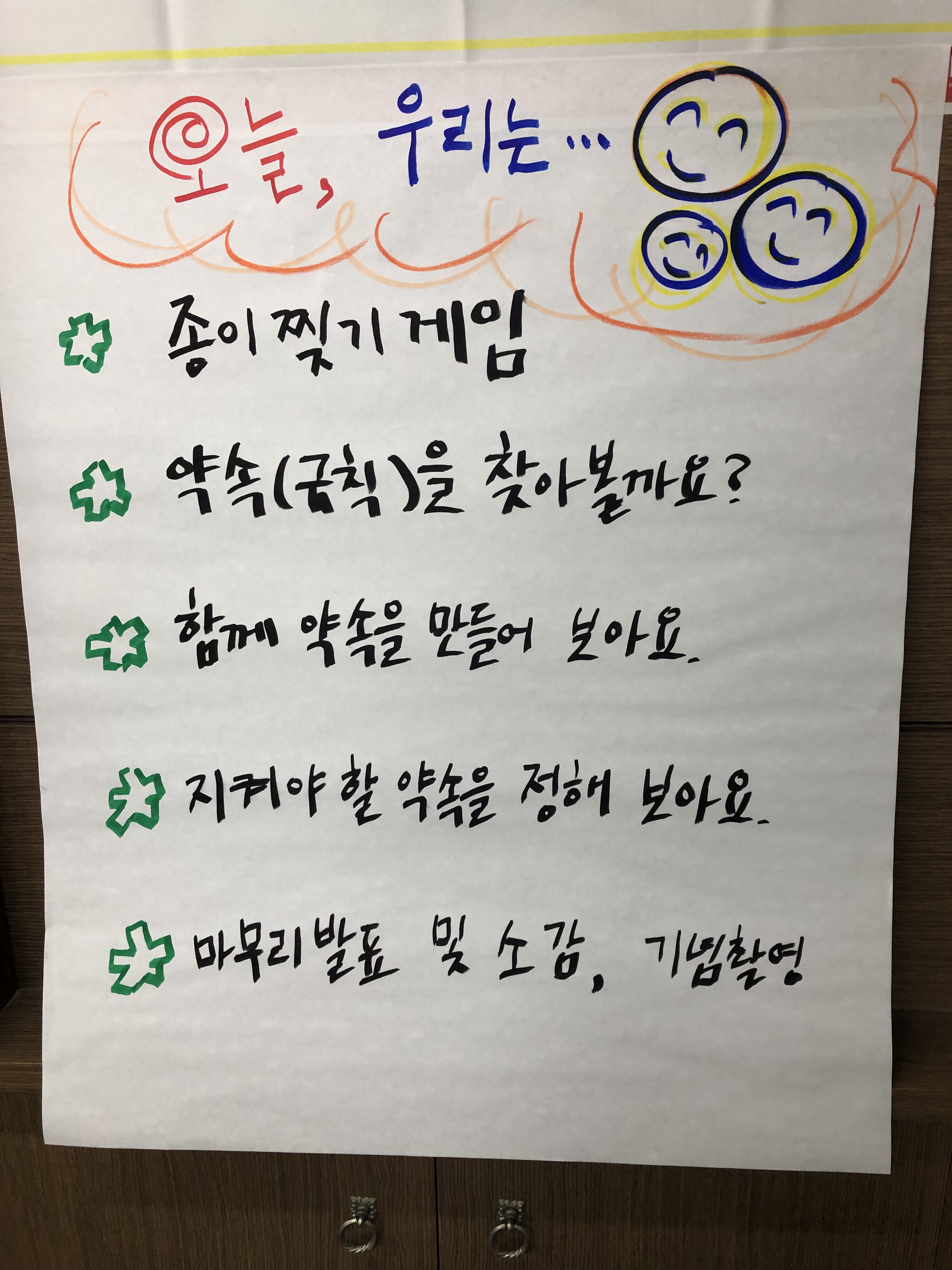 - 우리의 약속, 오늘의 순서(활동시 집중과 목적을 분명히 함으로써 활동시 집중하고 활동을 하다가 생기는 안건으로 전환되는 것을 막을 수 있음)