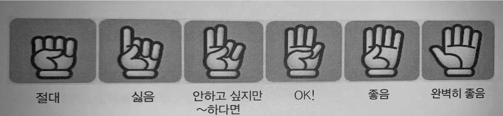 | 거부 | 심각한 반대 | 맘에 들지 않지만 지지 | 좀 더 논의 필요 | 기권 | 마음에 둔 것이 있지만 지지 | 사소한 논점이 있지만 동의 | 완정 지지 |