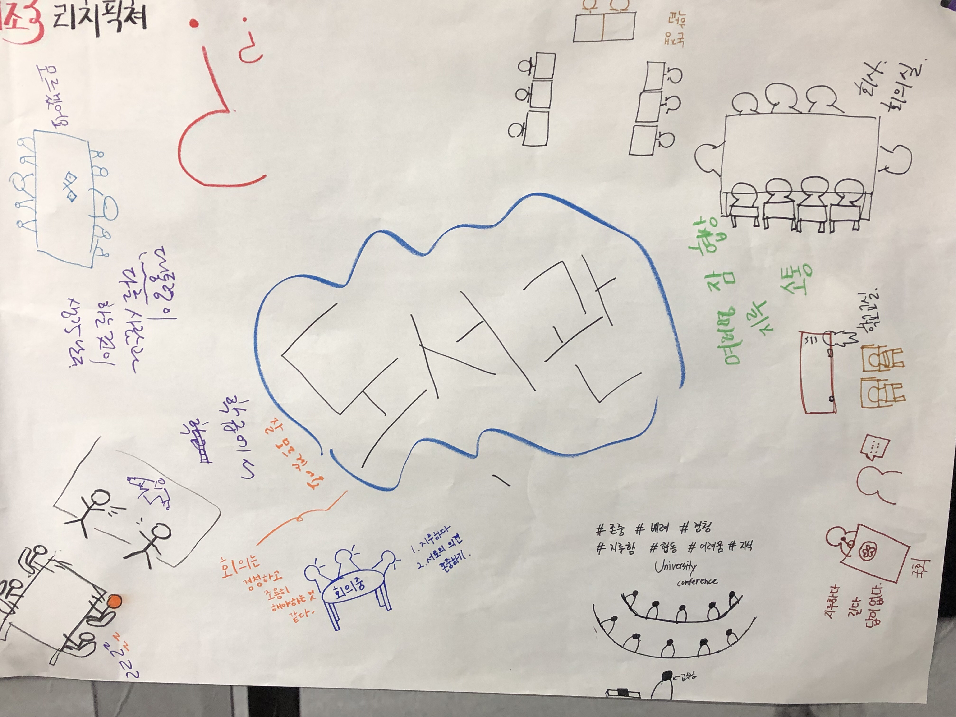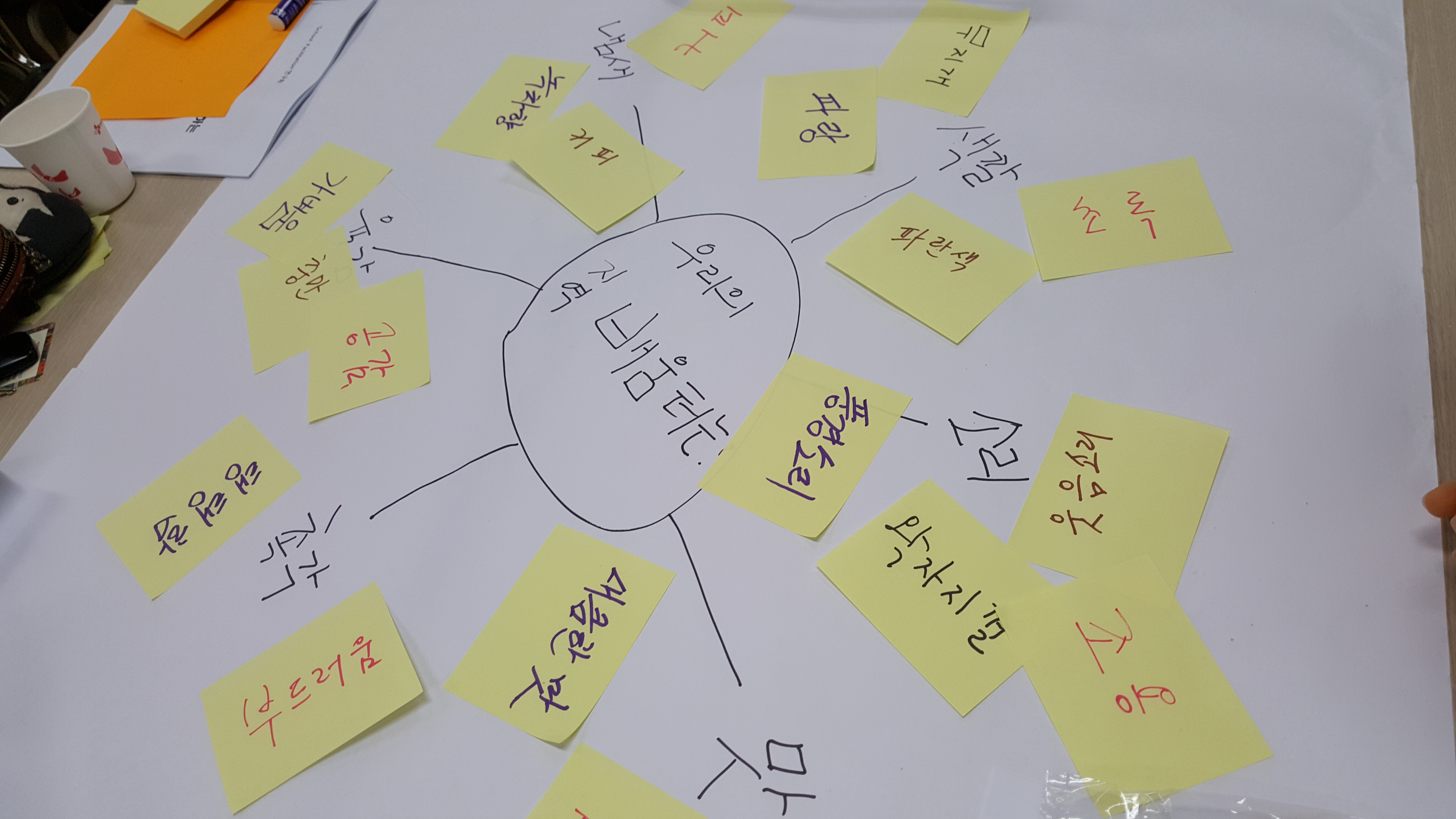 - 전지에 각자가 주제에 대한 이미지를 그림으로써 주제에 대한 공감과 참여자별 이해 종류를 확인할 수 있습니다.