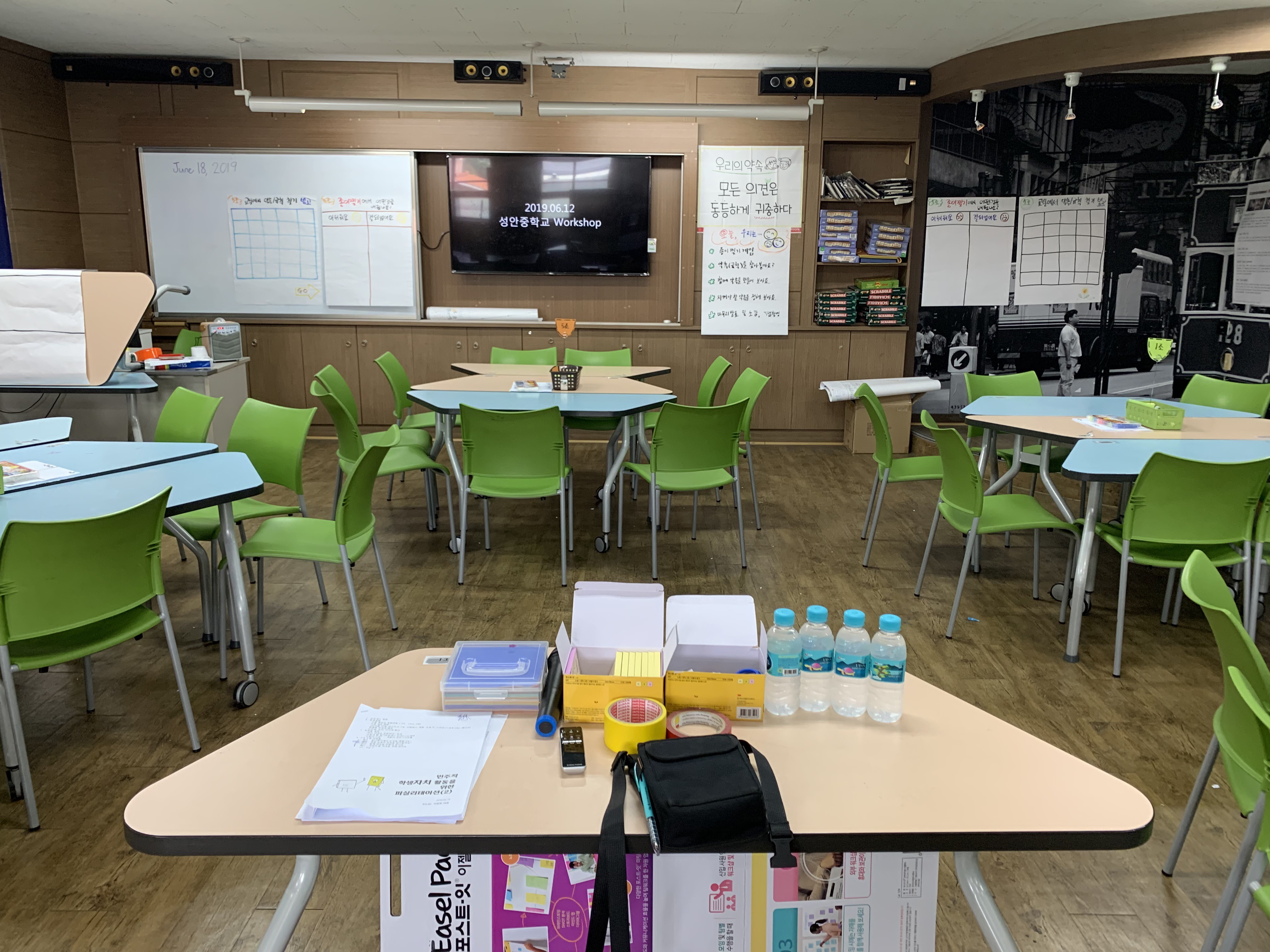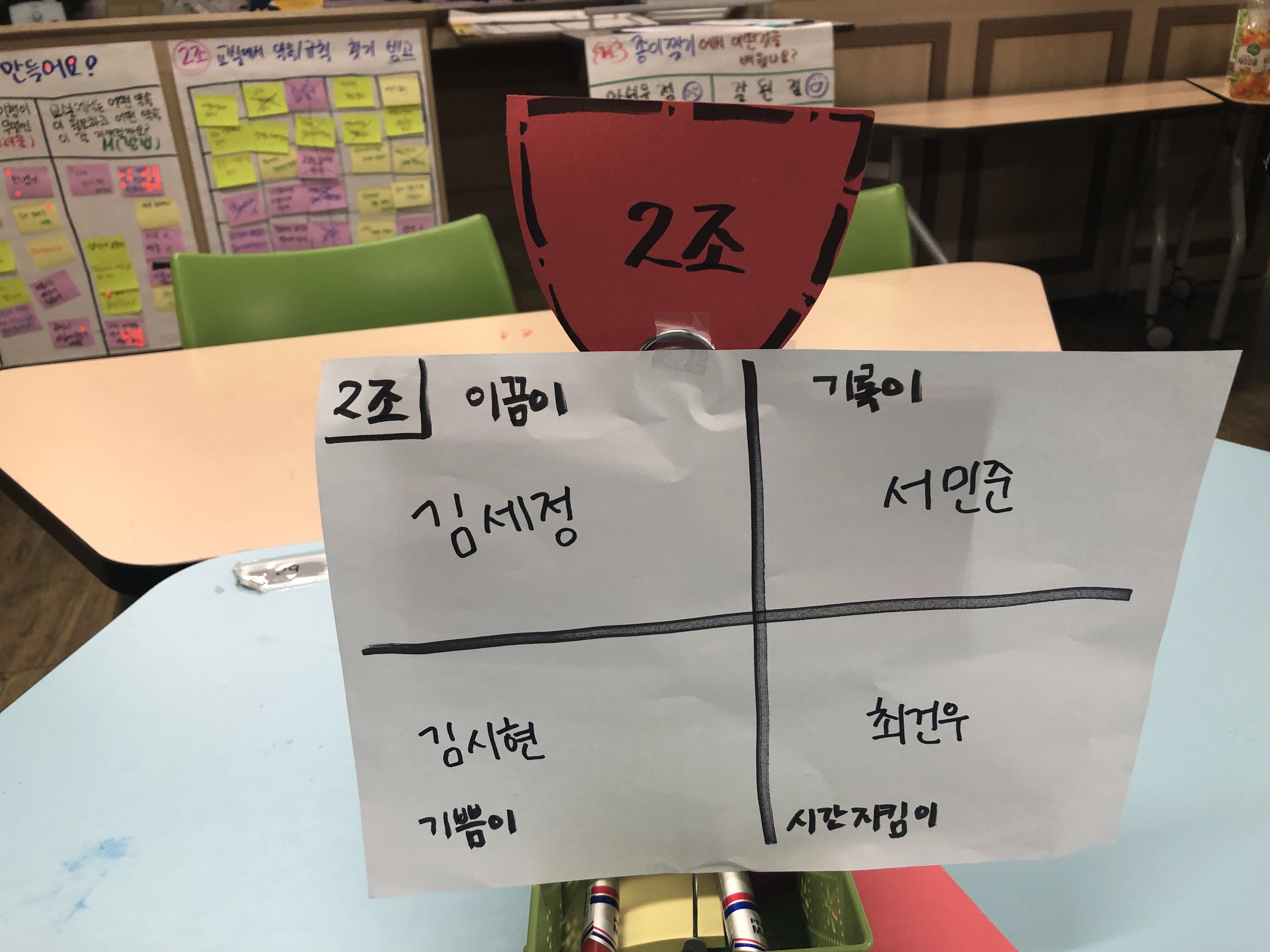 - 테이블별 도구 셋팅(마커펜, 점착 메모지, 이젤패드, 전지, 도트 스티커, 모래시간, A4, 각종 종이 등)
