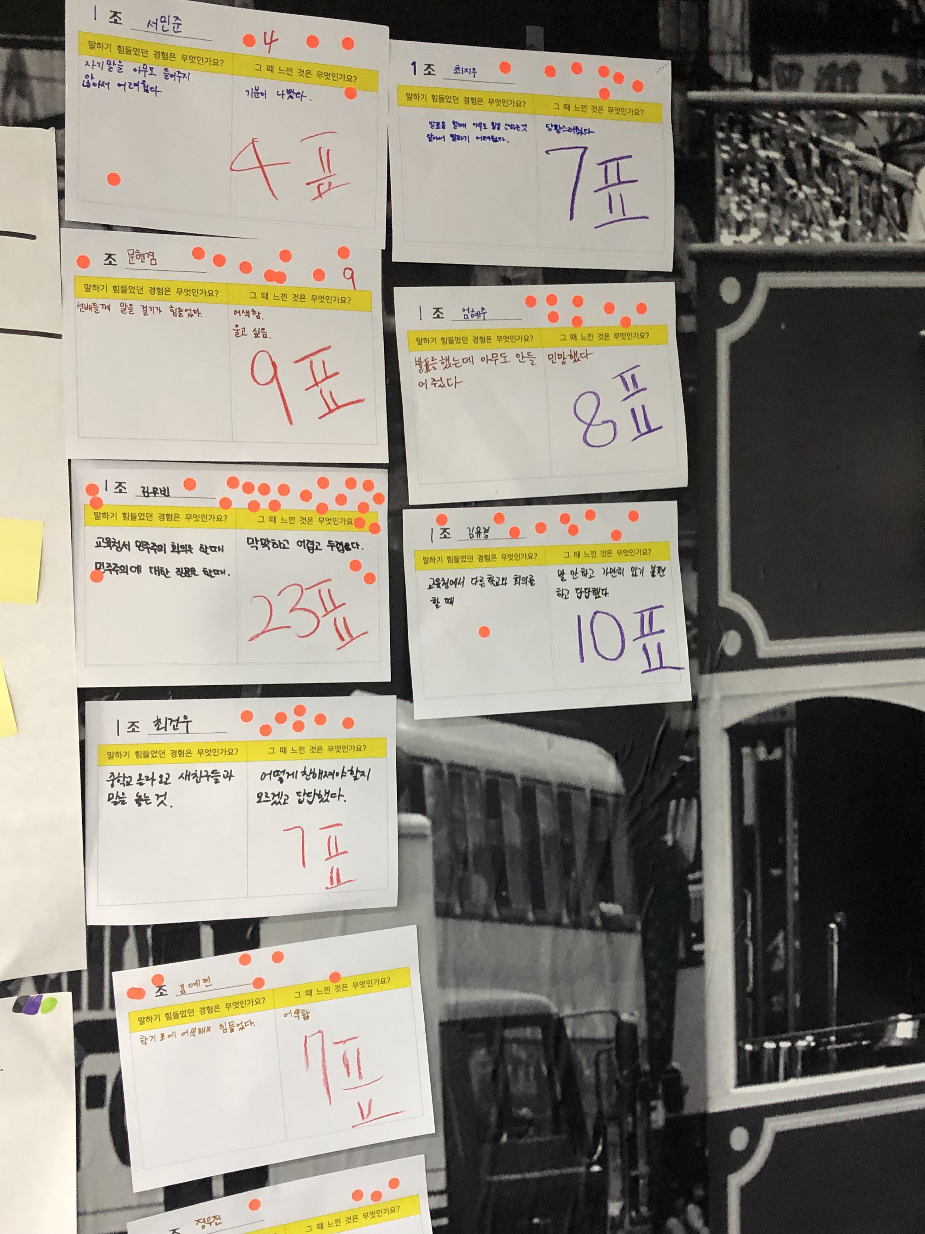 - 3-2-1표의 가중치를 두고 투표를 진행하고, 갤러리 워크를 통해 다른 조의 의견을 확인하고 투표를 진행합니다.