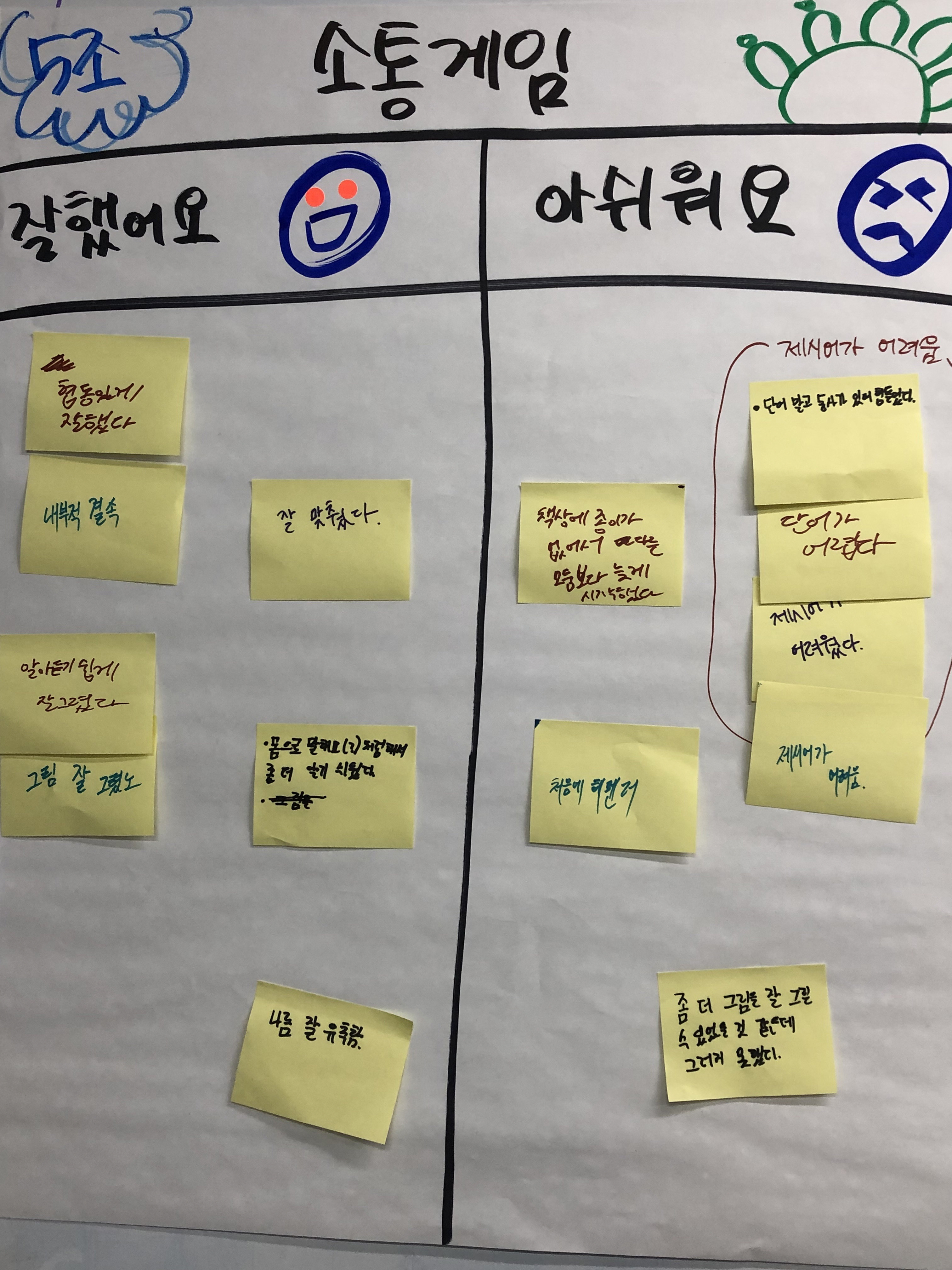 - 잘된 점과 아쉬운 점이라는 2가지 측면으로 아이디어 발산