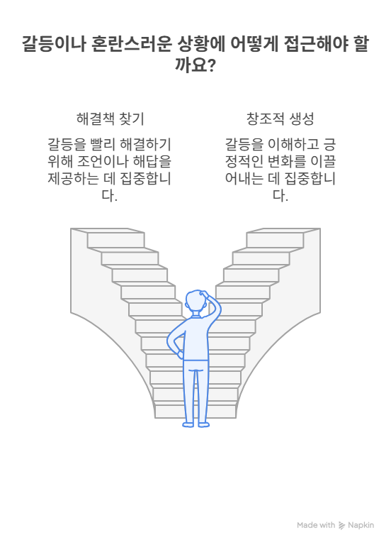 혼란과 갈등에서 대답을 찾는 것보다 '창조적 생성의 과정'으로 변화시키는 것이 중요하고, 이 창조적 생성을 위해 중요한 요소가 경청하기와 질문하기가 있다.