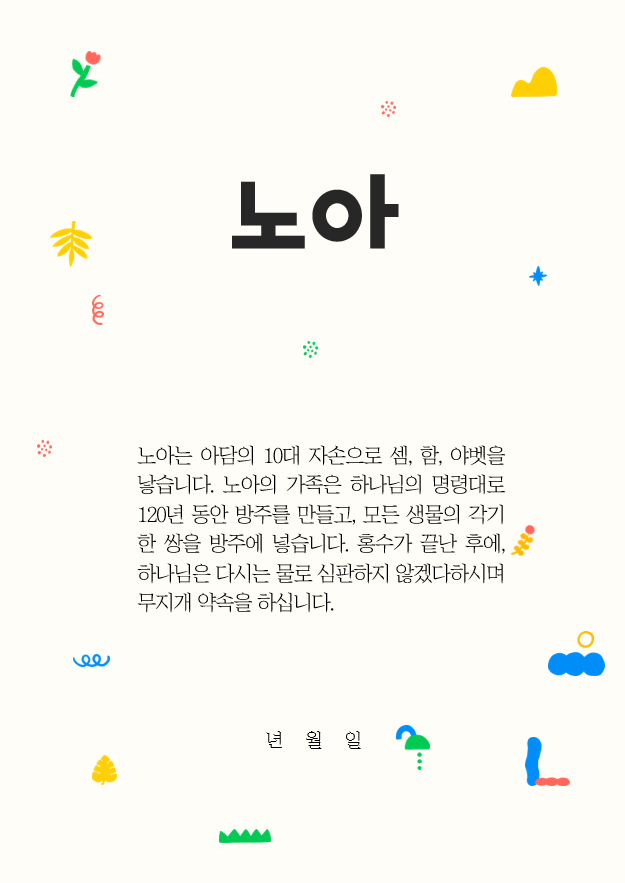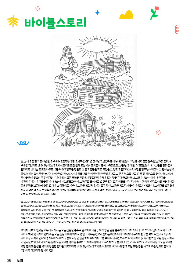 세상이 범죄하여 물로 심판받기 전에 방주를 만들 것을 명령받은 노아의 순종, 방주에 올라탄 생명들의 구원, 무지개를 통한 약속과 관련된 활동을 진행하였습니다.