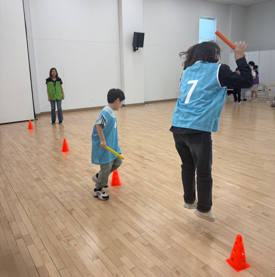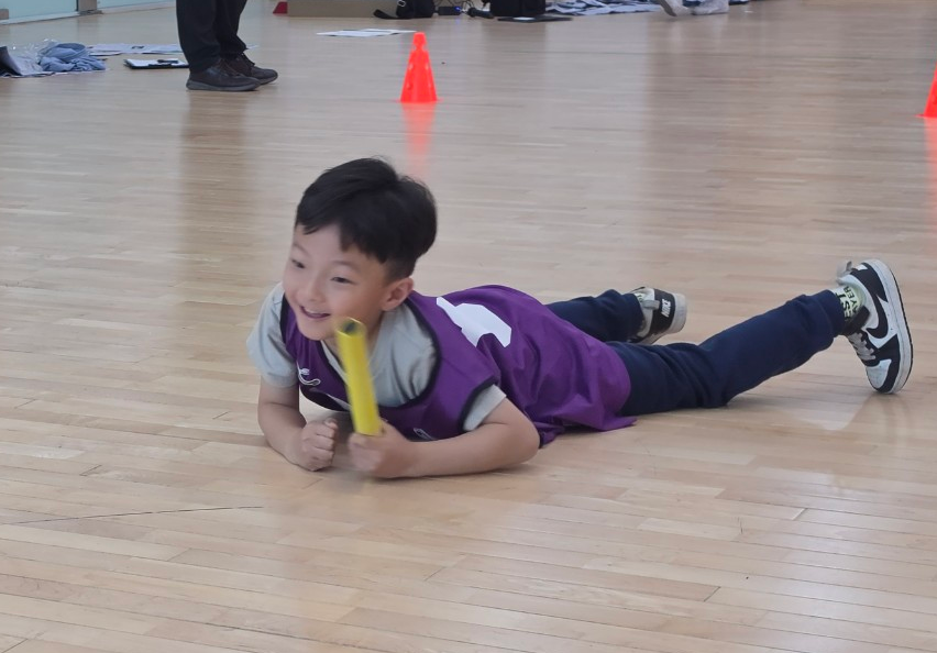 - 출발 라인에서 달려가 가운데 콘을 1~3바퀴 돌고, 무대 위의 동물 스티커의 쌍을 찾아 돌아오기