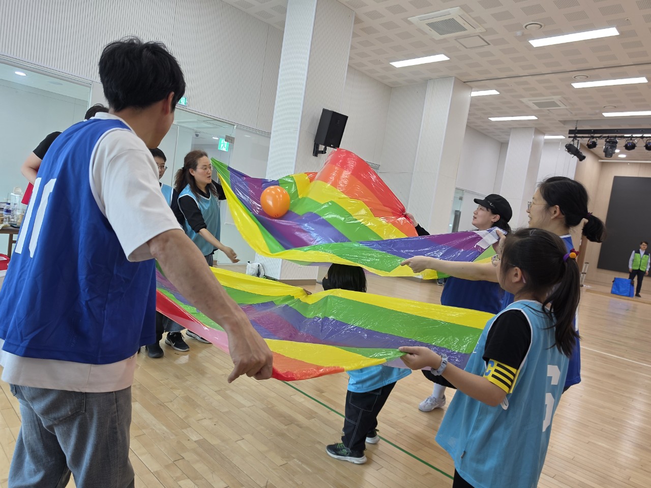 - 풍선 나르기 : 팀의 2개 조가 풍선을 천 위에 올려 달려 전달하기