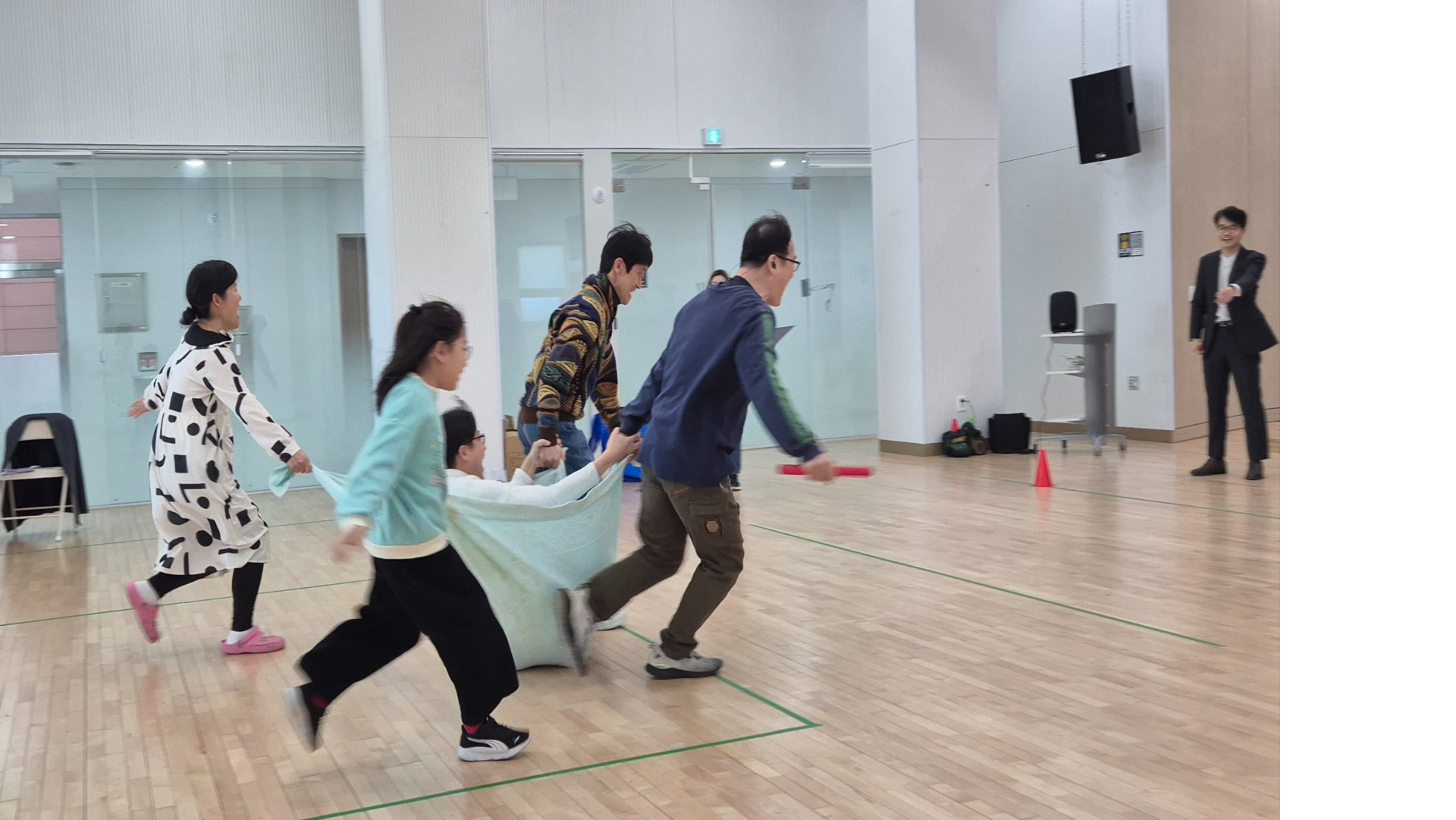 - 잠잠하라 : 커다란 천 위에 팀원들이 함께 올라서서 풍랑(볼풀공의 공격)을 뚫고 전진하기